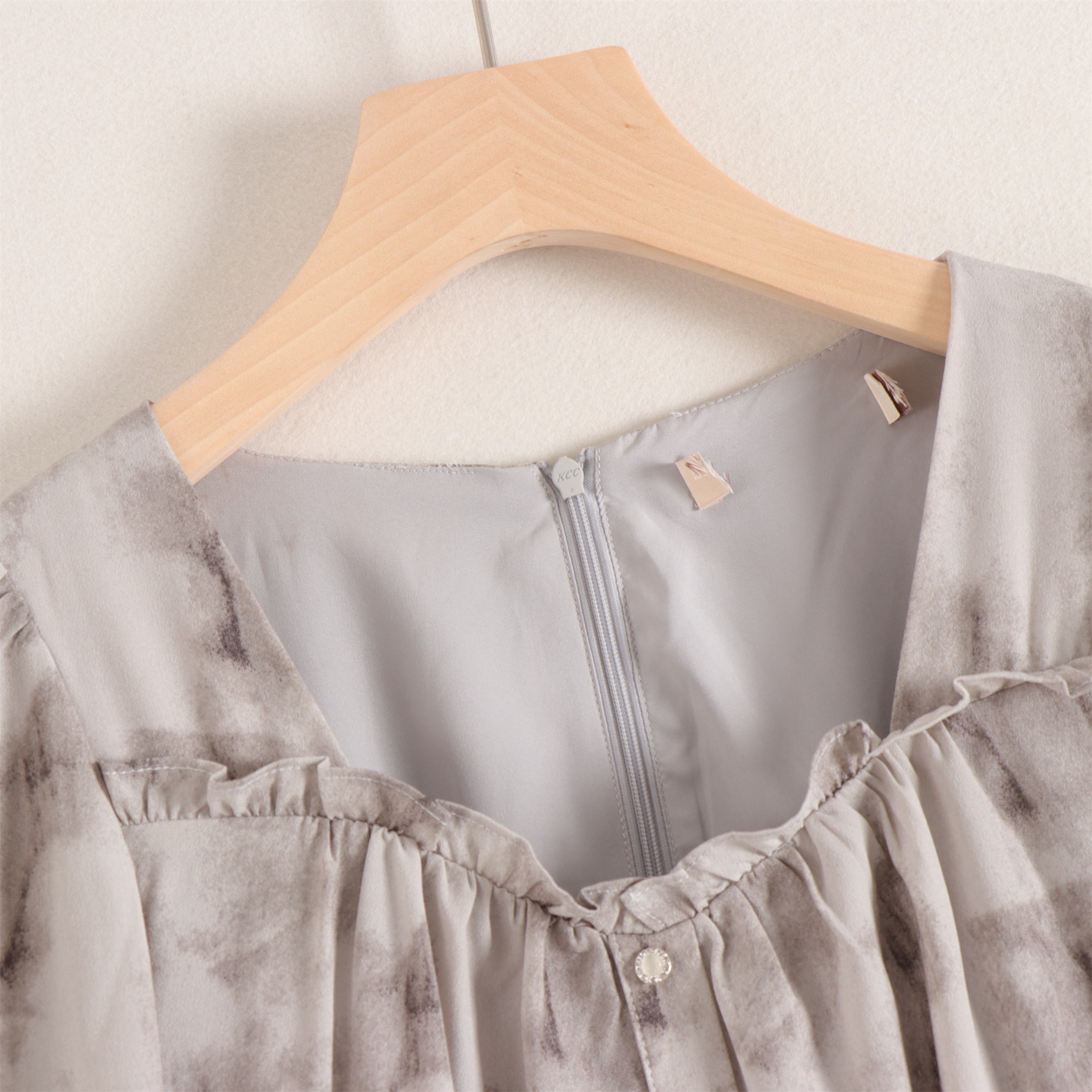 复古国风水墨印花收腰系带修身方领泡泡袖中长款雪纺连衣裙25秋装