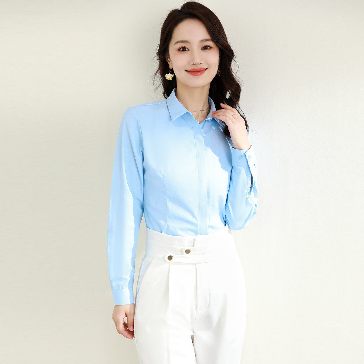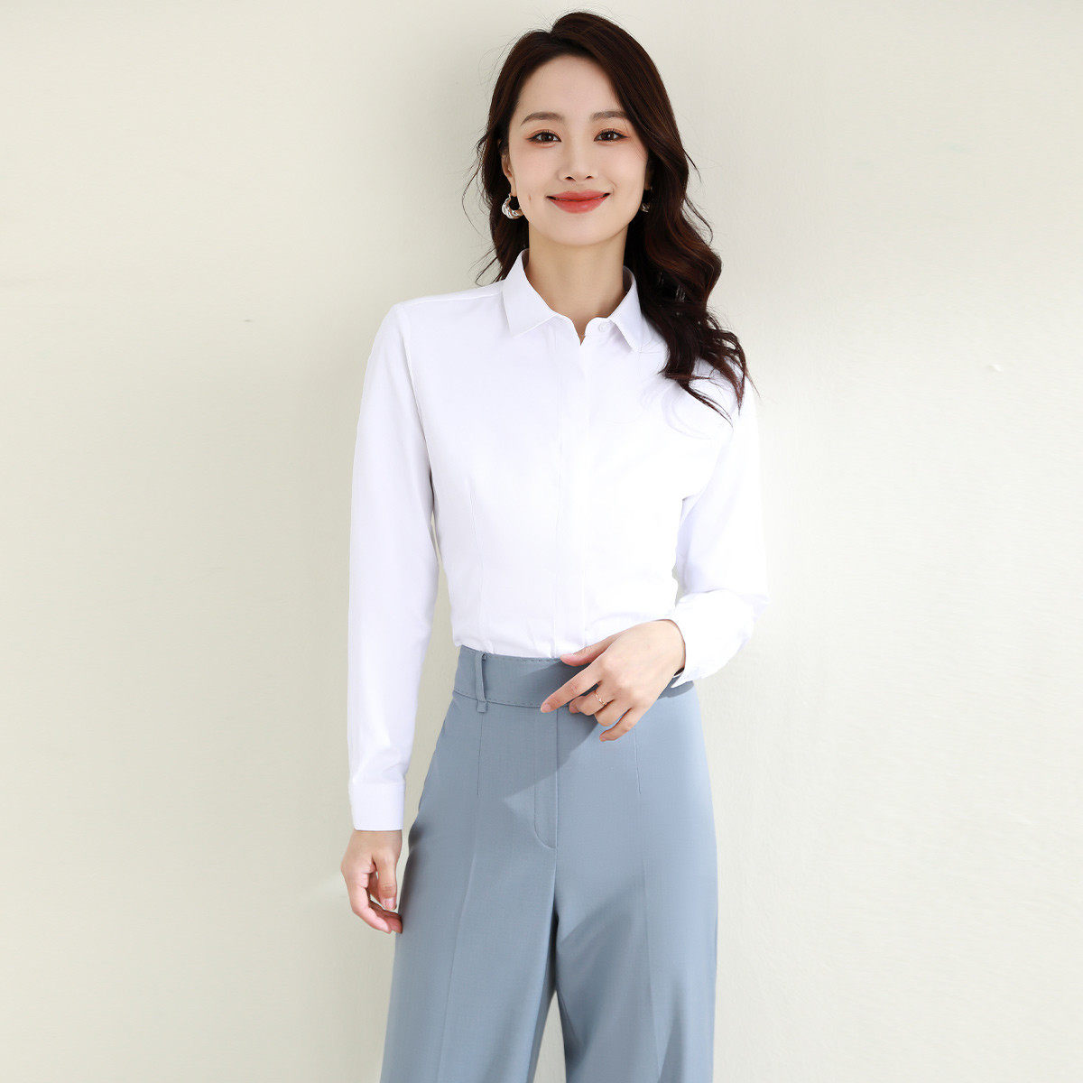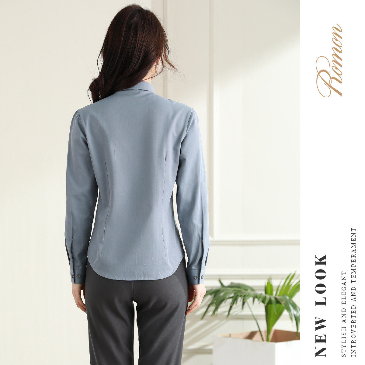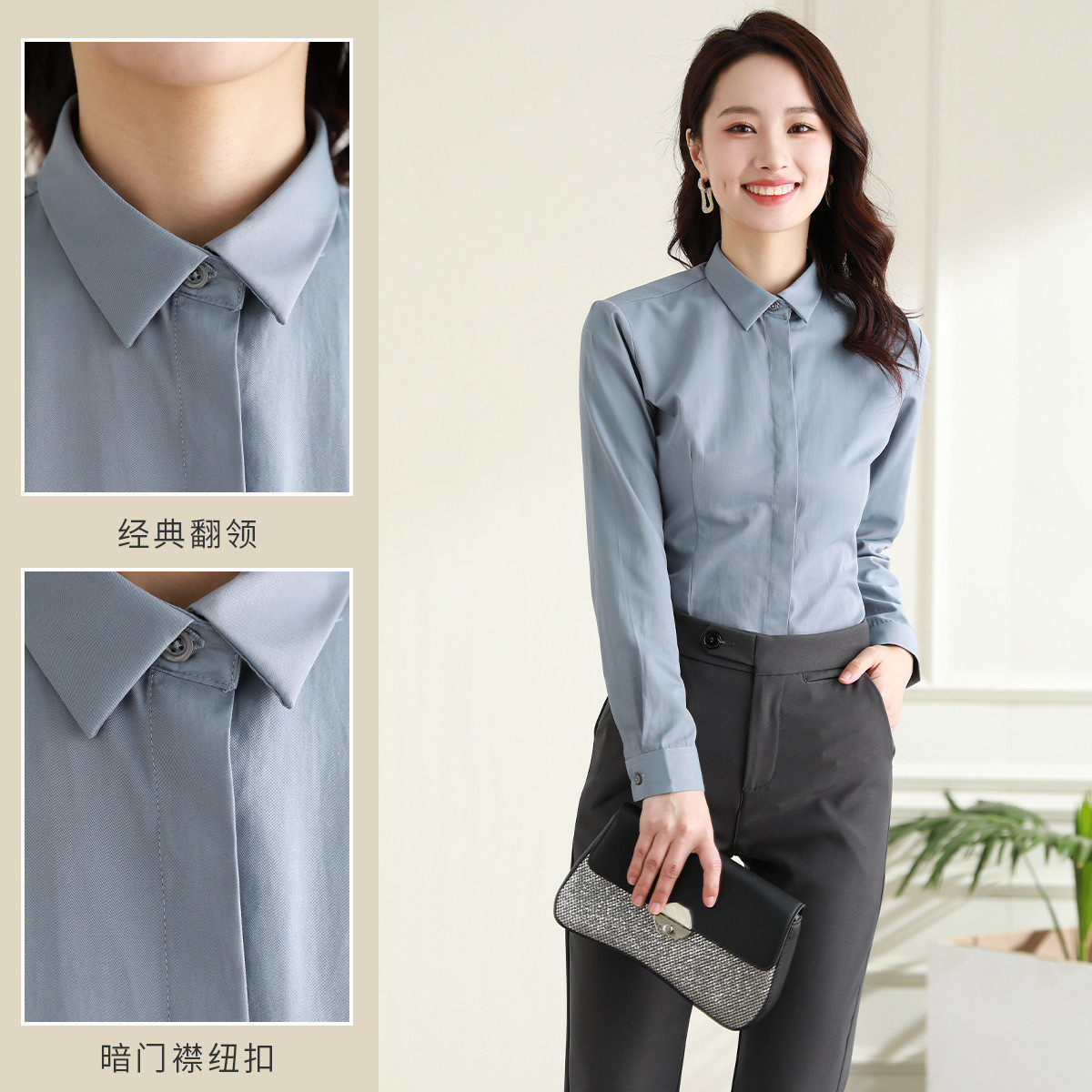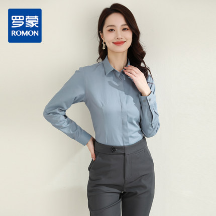 罗蒙春秋女装长袖衬衫女士修身款暗门襟弹力棉质衬衣通勤职业上班