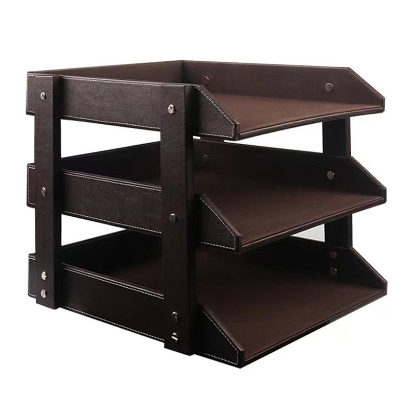 热销工厂黑色三层文件拆装可盘防滑桌面收纳资料架皮革文件架