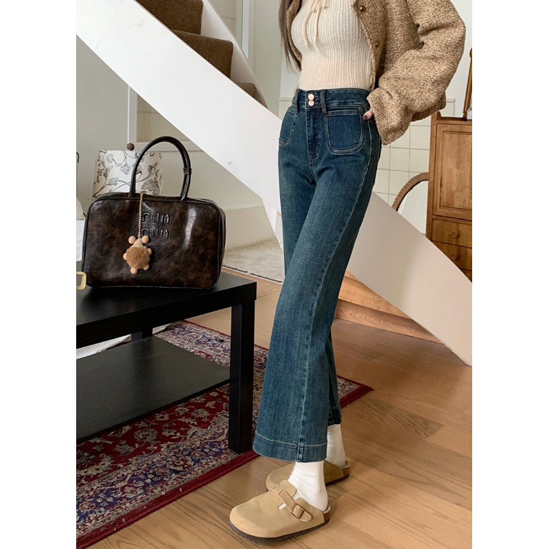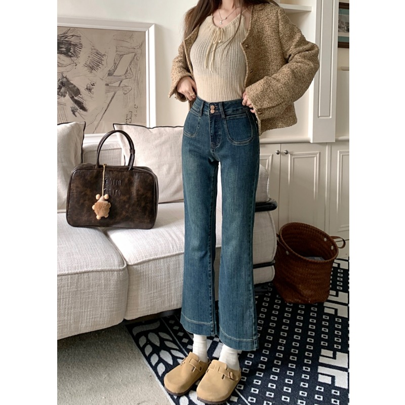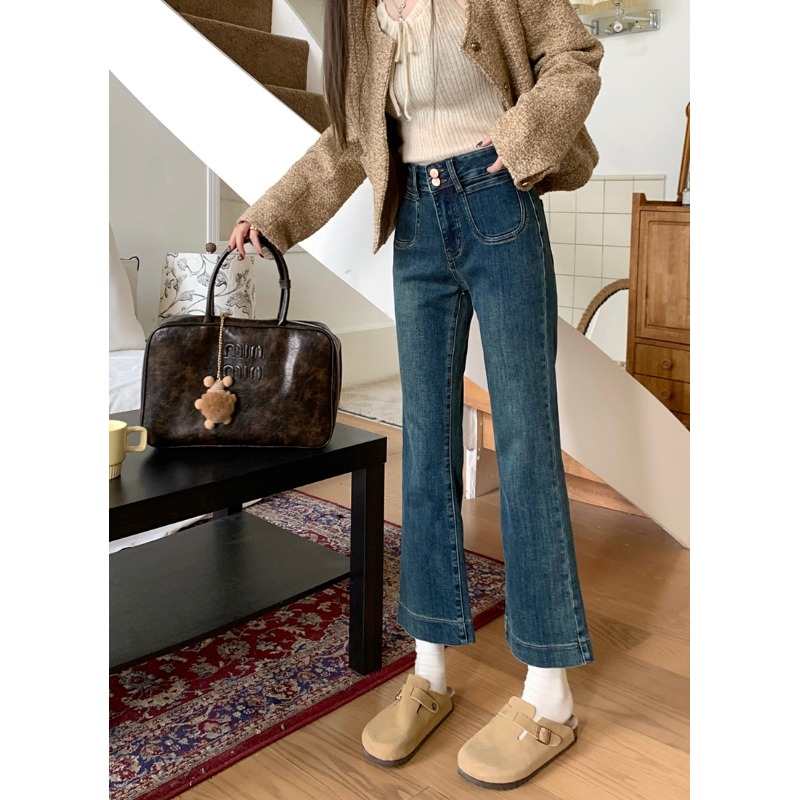 小个子145复古水洗弹力牛仔裤八分女150设计感微喇叭九分直筒裤xs
