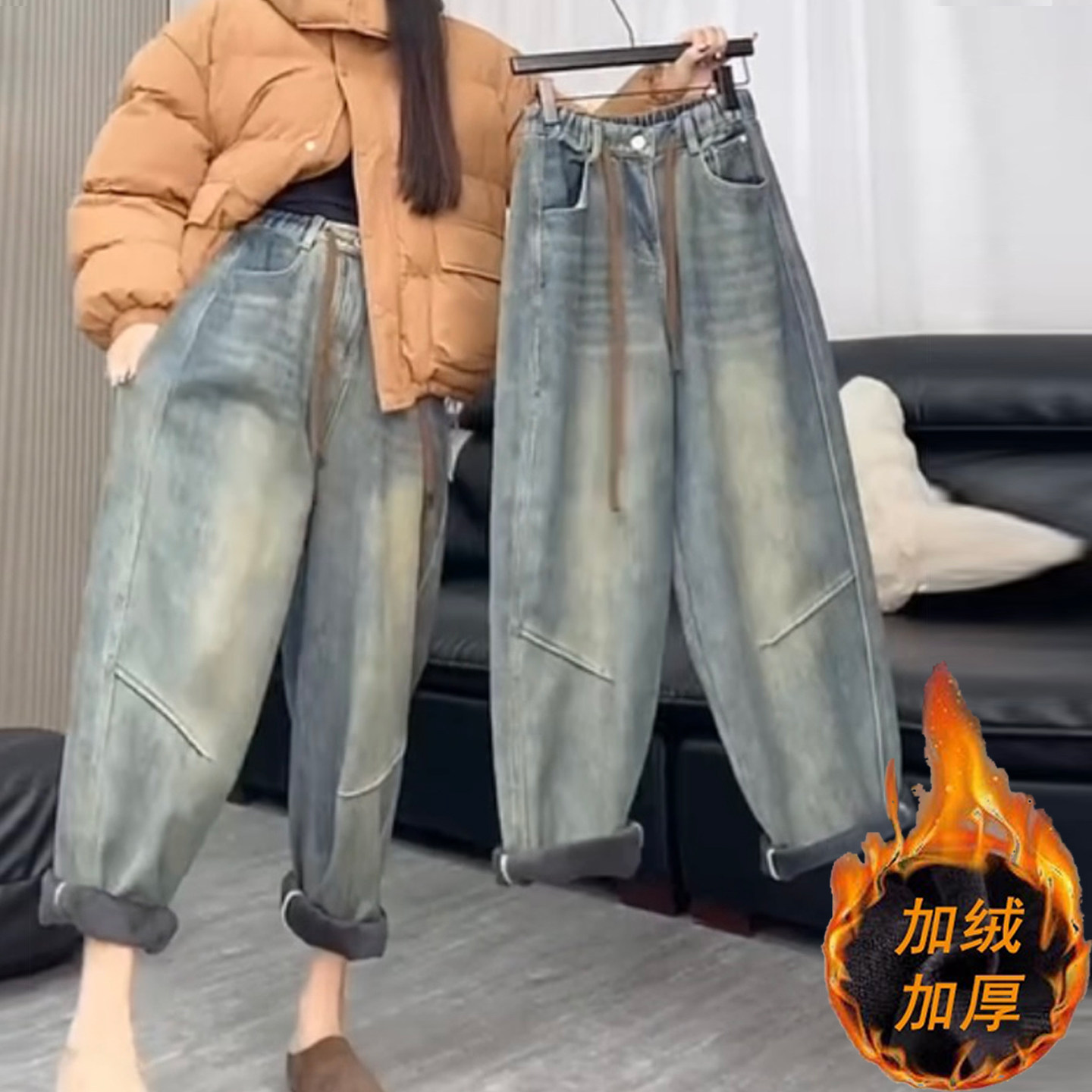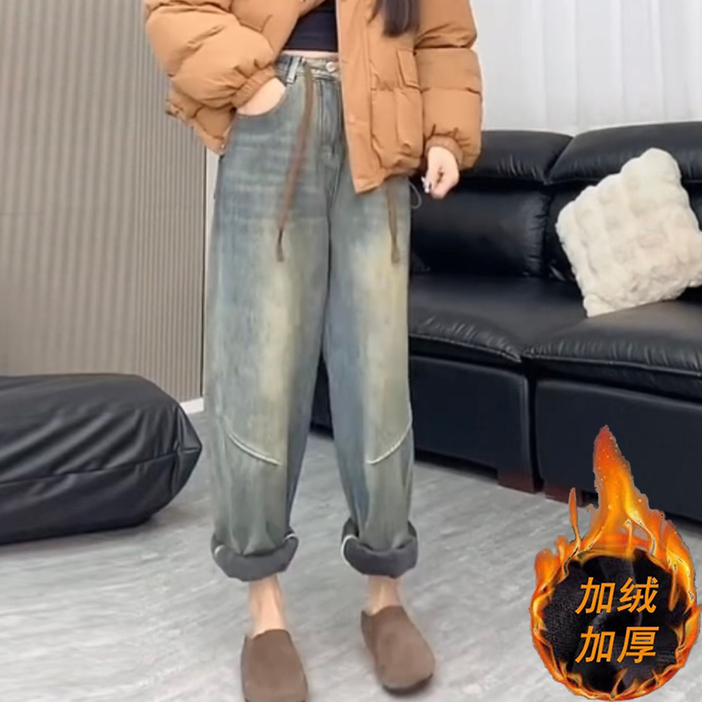 加绒加厚宽松牛仔老爹裤女