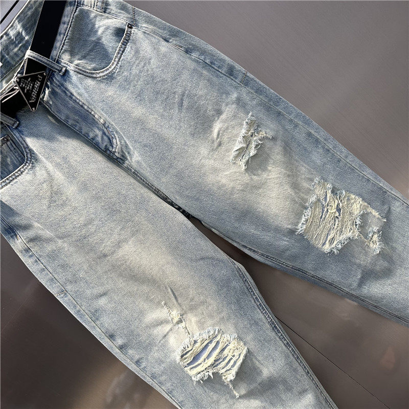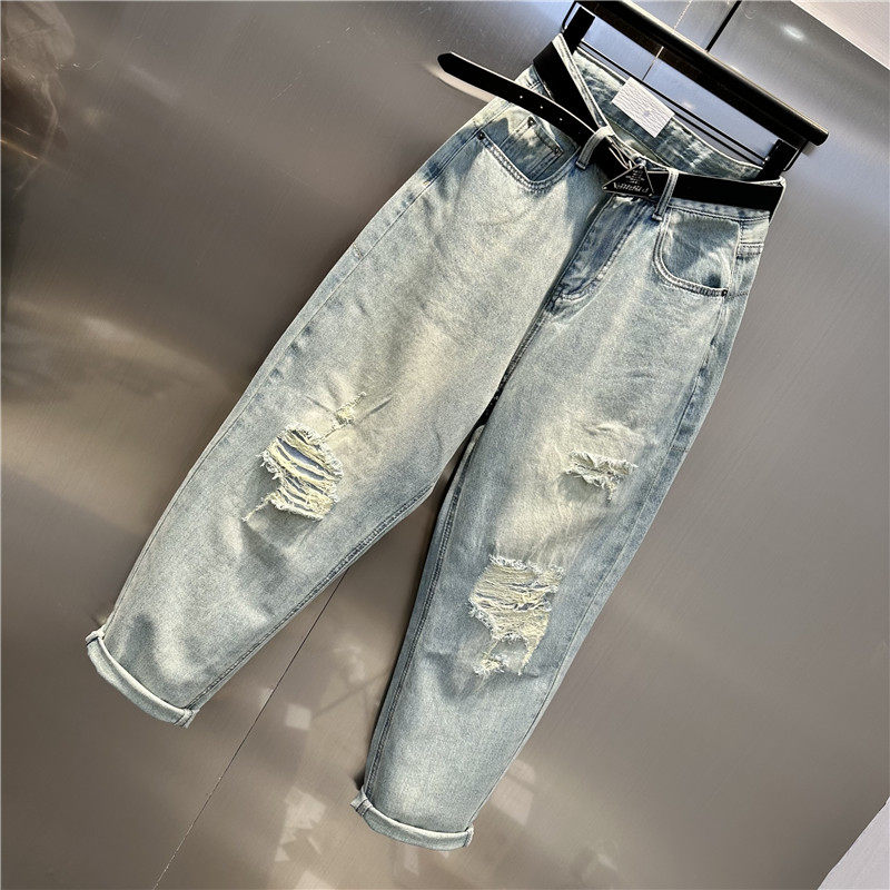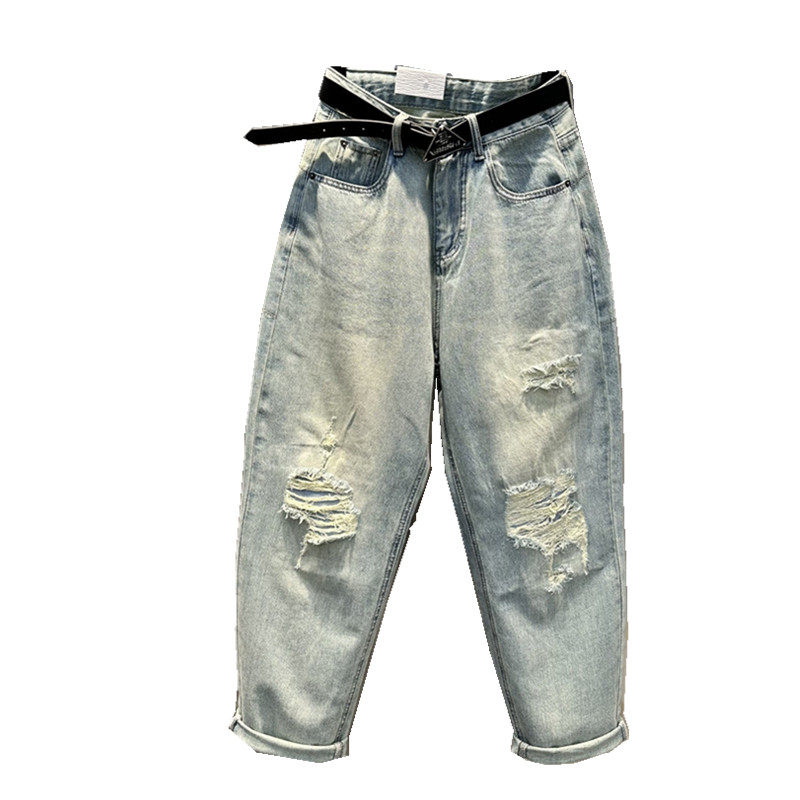 欧洲站2024年夏季新款薄料破洞乞丐牛仔老爹裤宽松大码bf风垮裤女