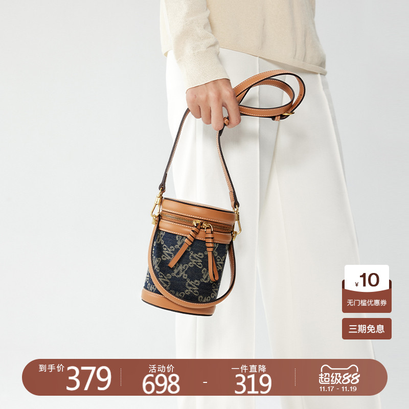万里马时尚圆筒单肩包个性丹宁牛仔包休闲女包水桶包女通勤休闲