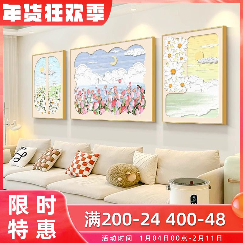 ins奶油风客厅装饰画高级感肌理花卉三联壁画油画沙发背景墙挂画