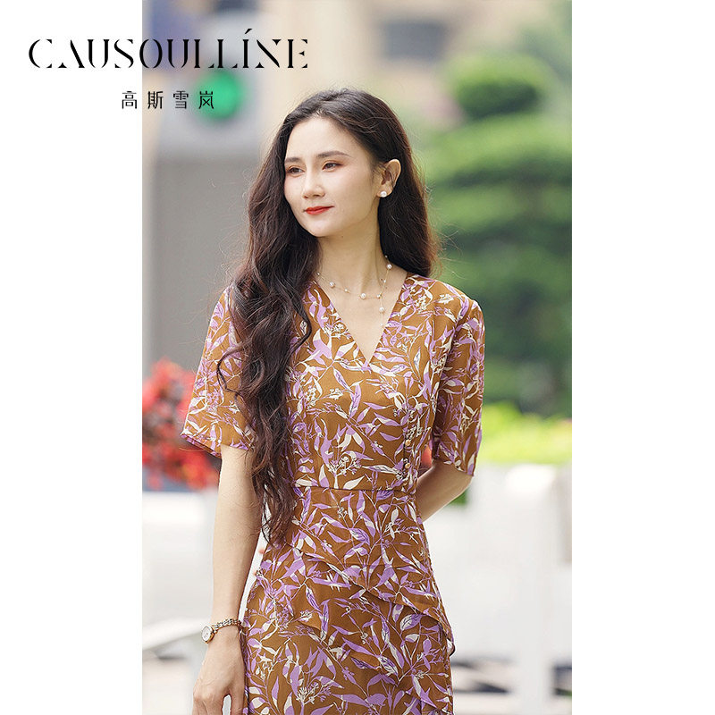 高斯雪岚2024夏季新款千金风法式气质连衣裙印花荷叶边不规则女裙