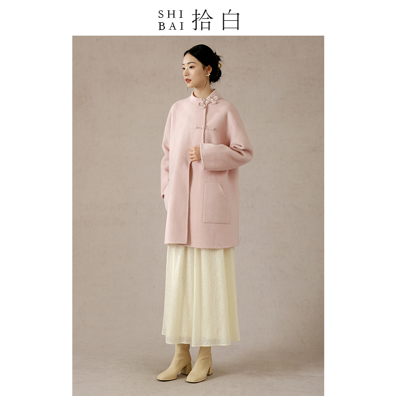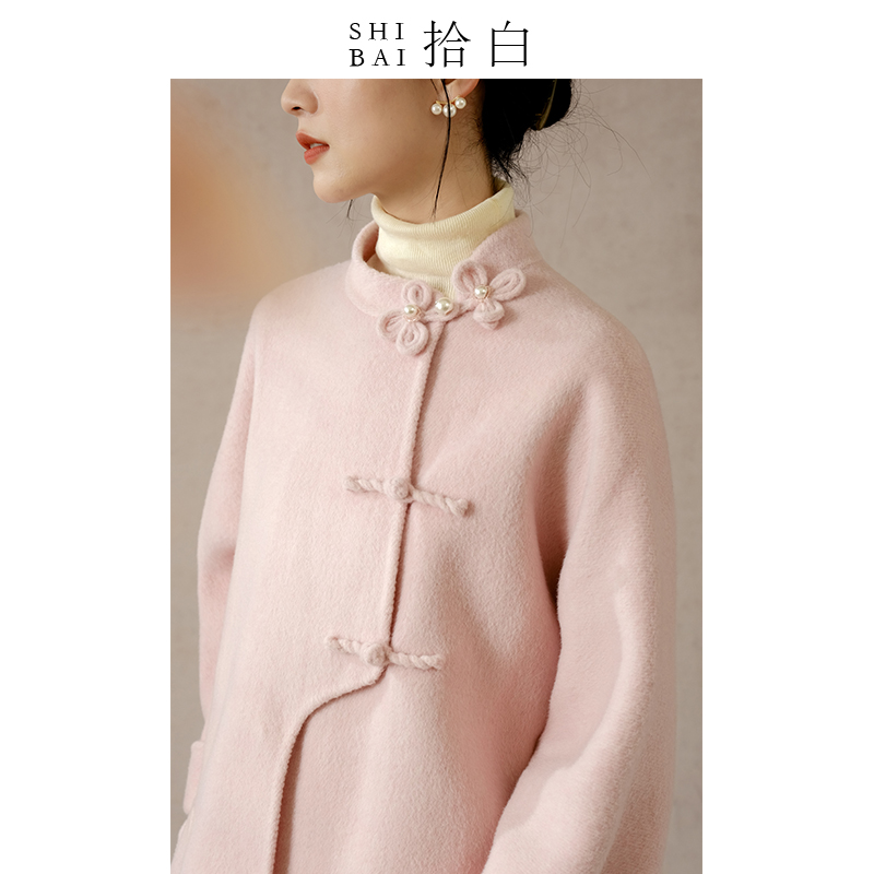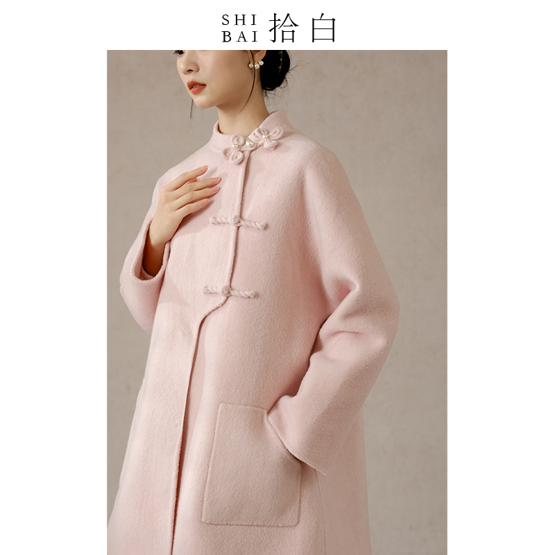 SHIBAI拾白新中式大衣秋冬粉色高端100%进口澳毛双面羊绒毛呢外套