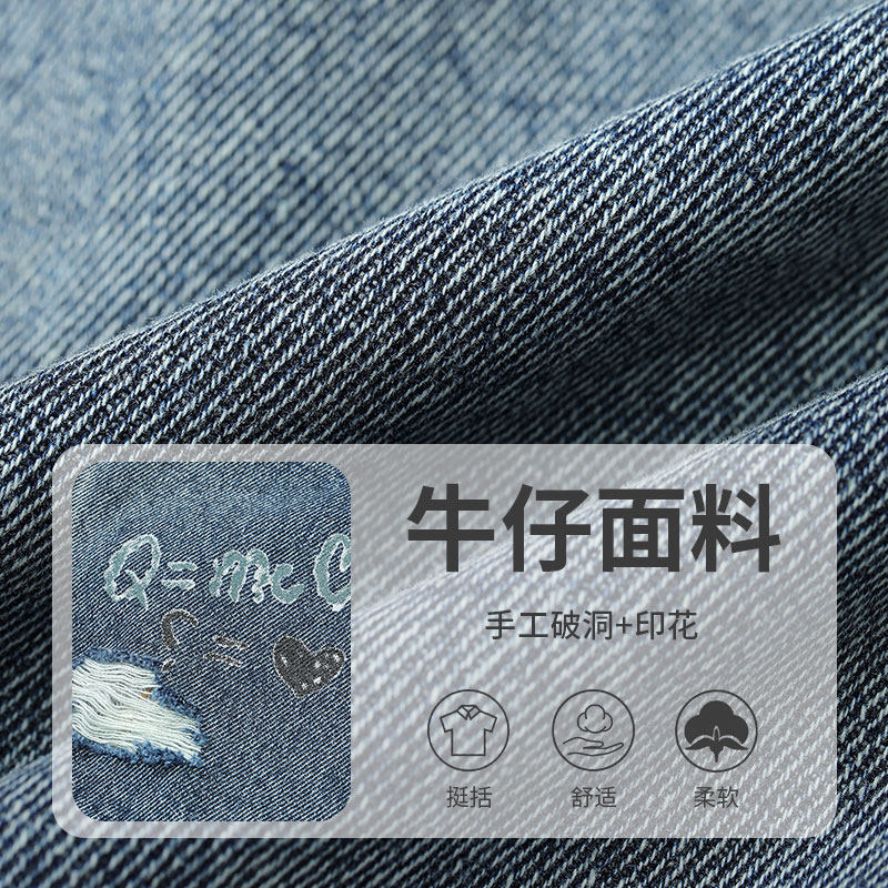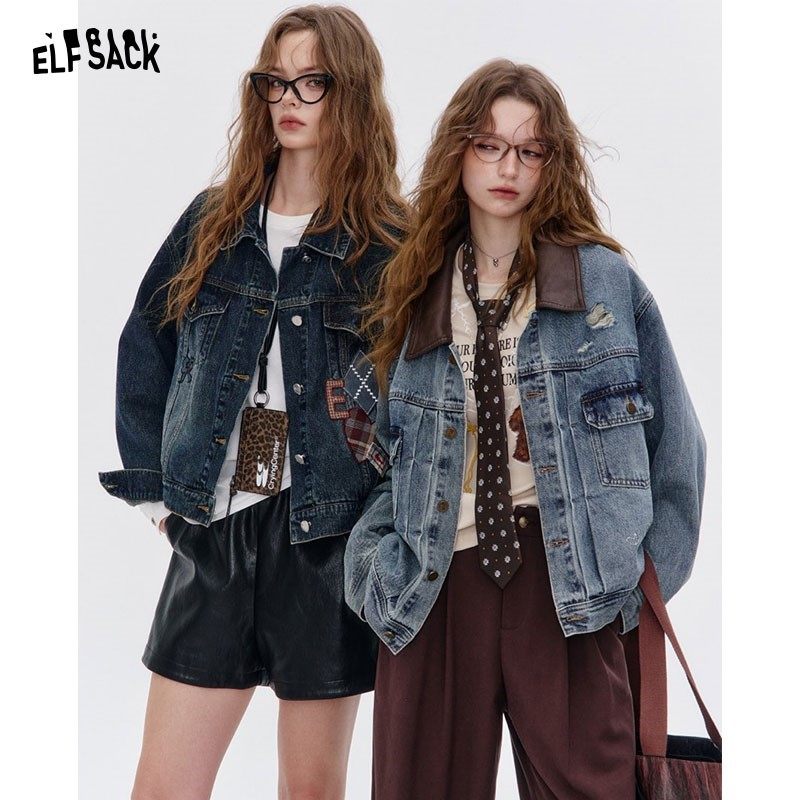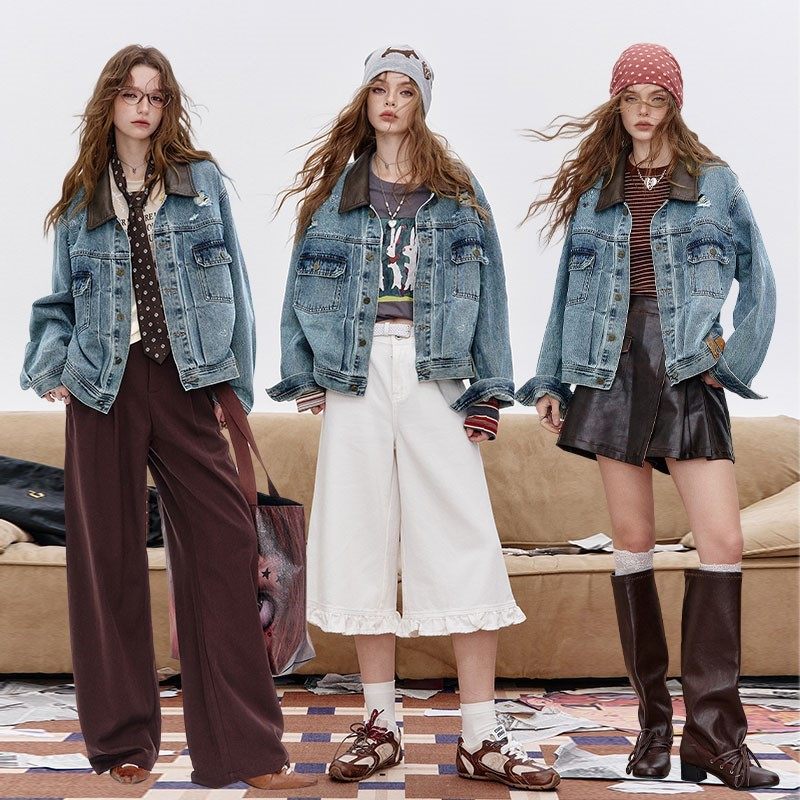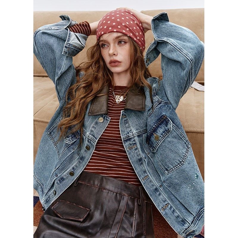 破洞印花牛仔外套女2025年秋季新款撞色领宽松显瘦上衣
