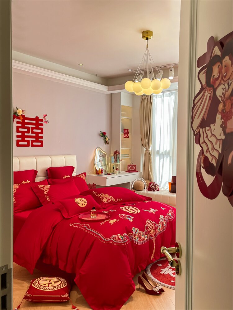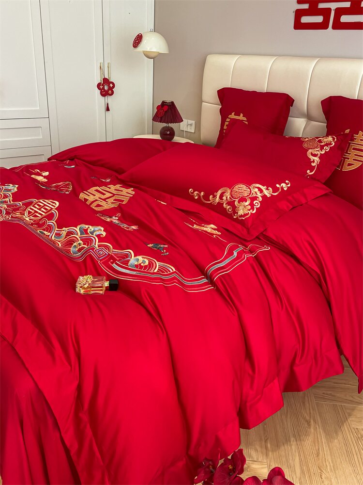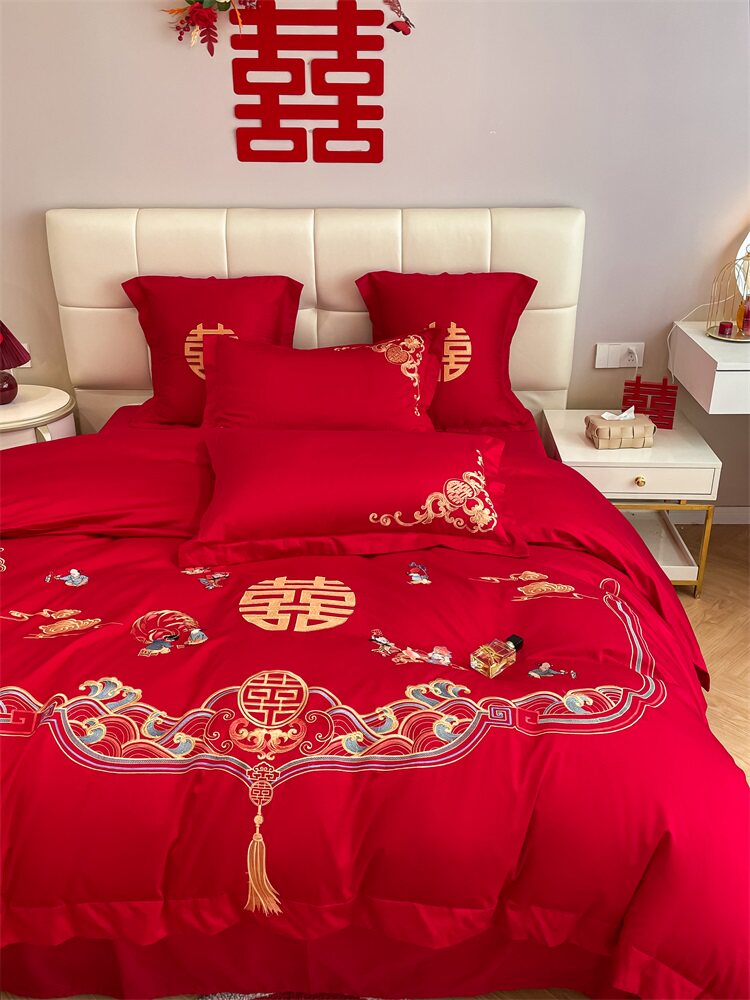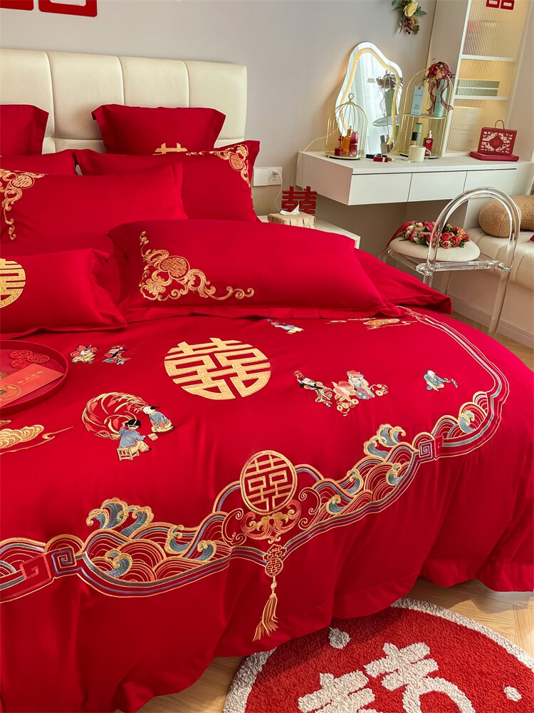 高档中式百子图刺绣结婚四件套红色床单被套纯棉喜被婚庆床上用品