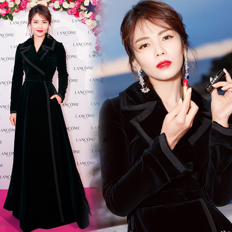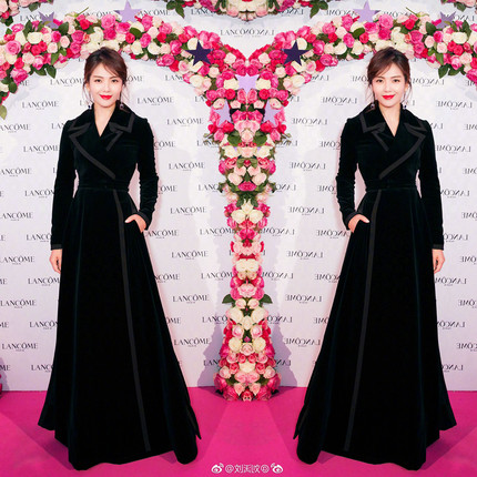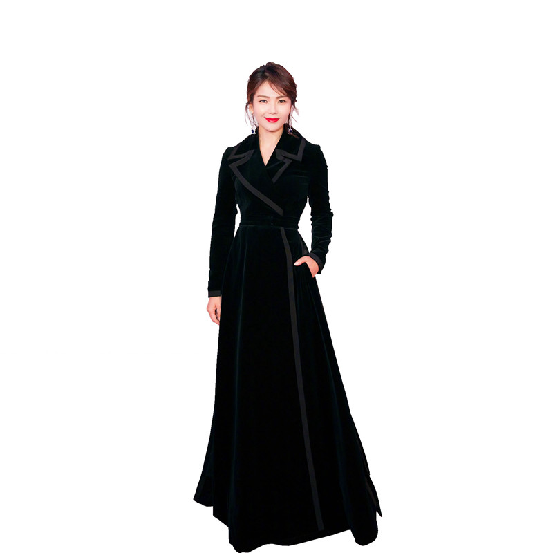 刘涛同款时尚修身黑色长款风衣重工名媛气质显瘦过膝丝绒大衣外套