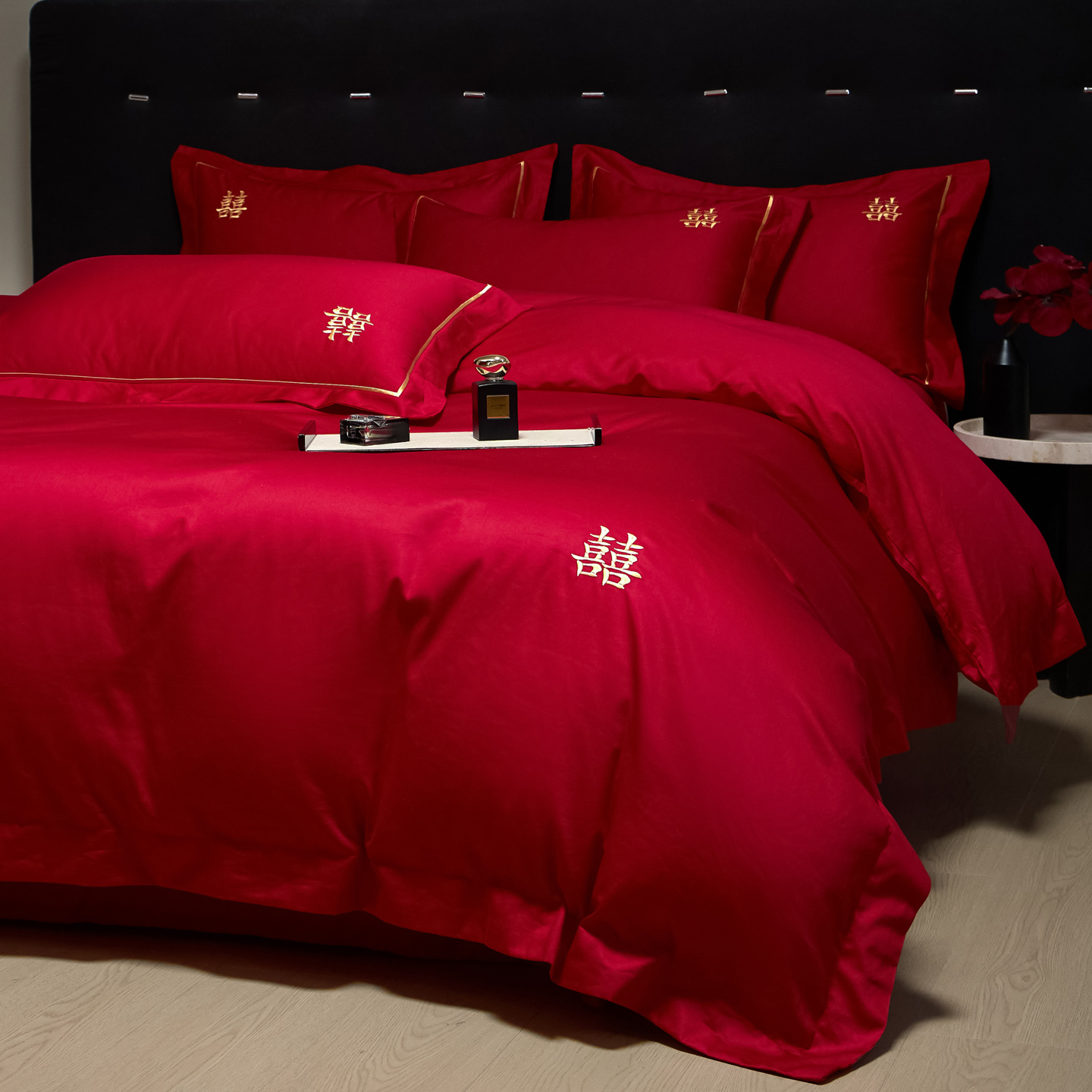 简约喜字刺绣结婚四件套红色纯棉被套婚庆喜被婚房床上用品婚嫁娶