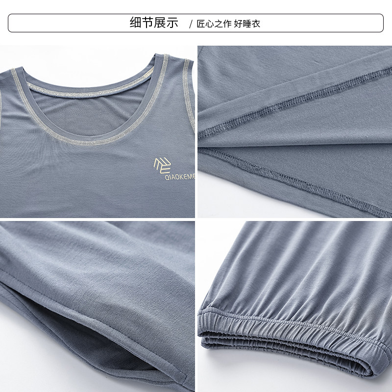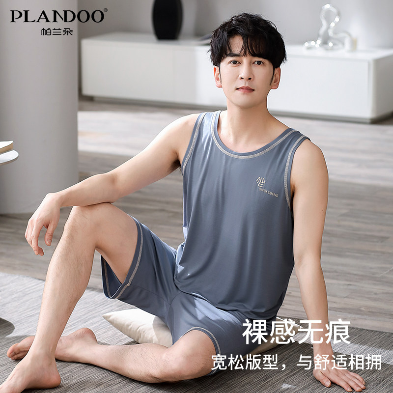 帕兰朵夏天无袖睡衣男款冰丝背心莫代尔短裤夏季简约宽松男家居服