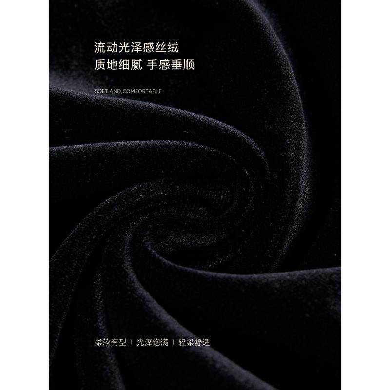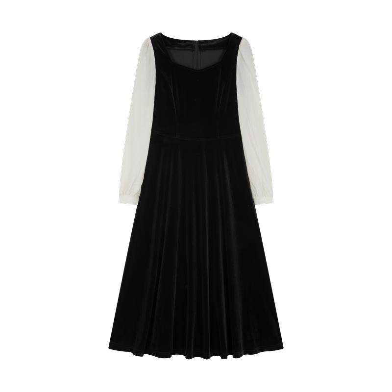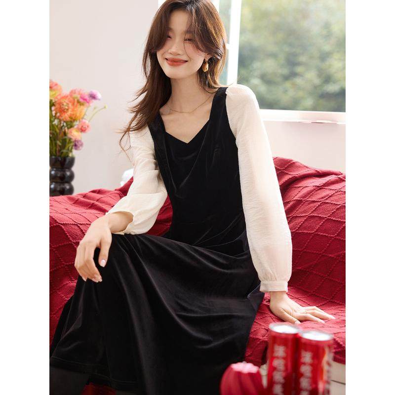 沫晗依美优雅小黑裙丝绒拼接伞摆年会礼服连衣裙2025春季新连衣裙