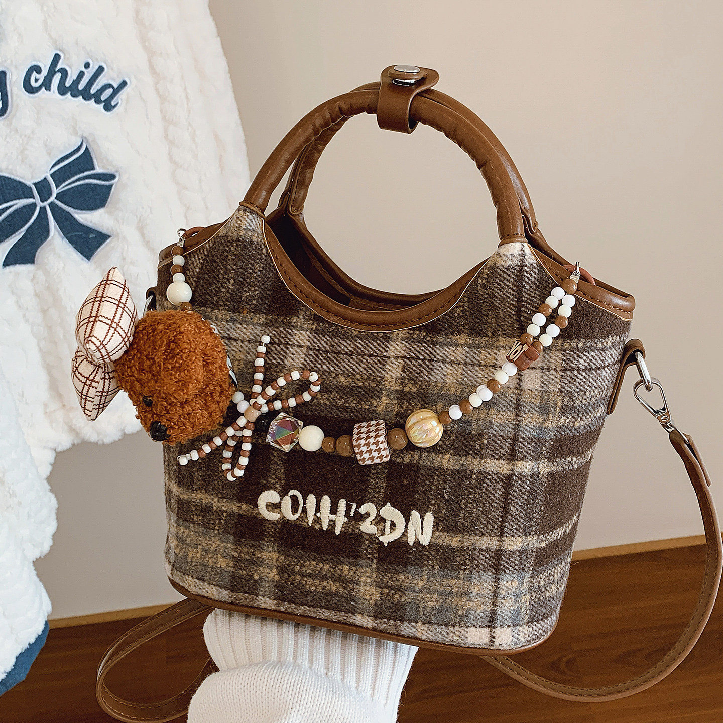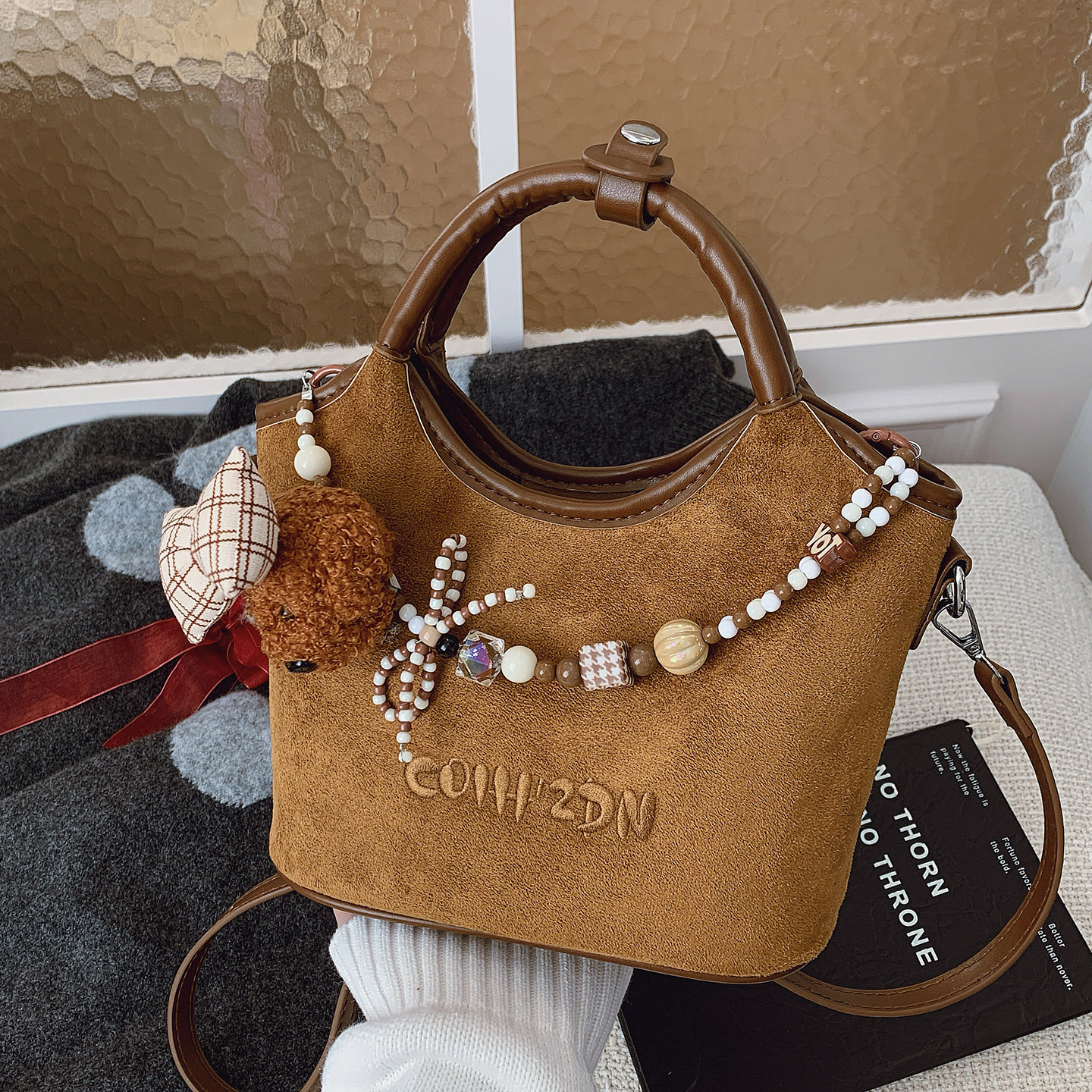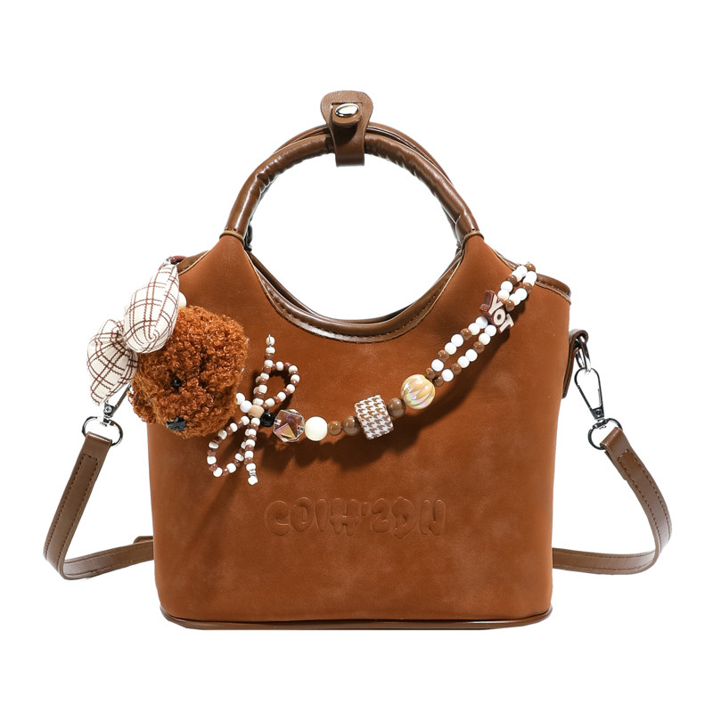 时尚甜美风手拎水桶包女式2026新款秋冬复古韩系麂皮绒单肩斜挎包