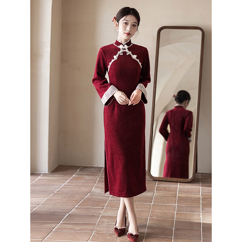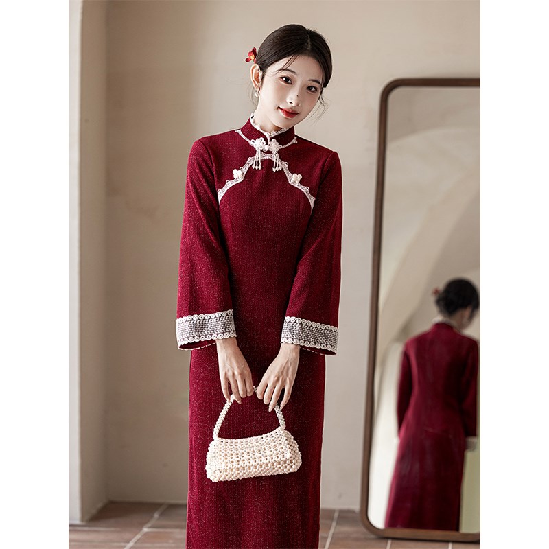 红色旗袍敬酒服结婚秋冬季加绒回门服新娘新中式婚服订婚礼服长袖