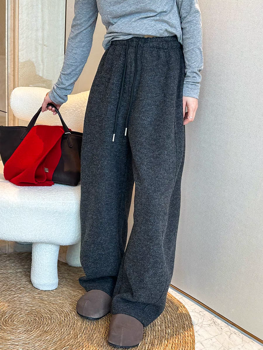 抽绳系带羊毛呢加绒阔腿裤女欧洲站2025冬装新款欧货女装休闲裤潮