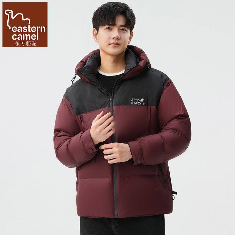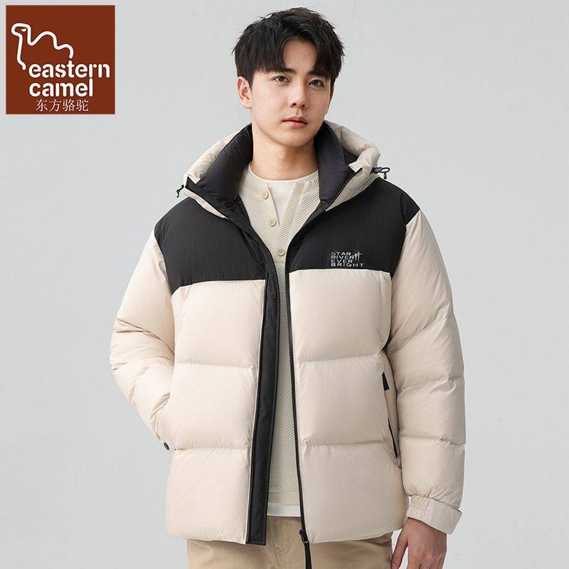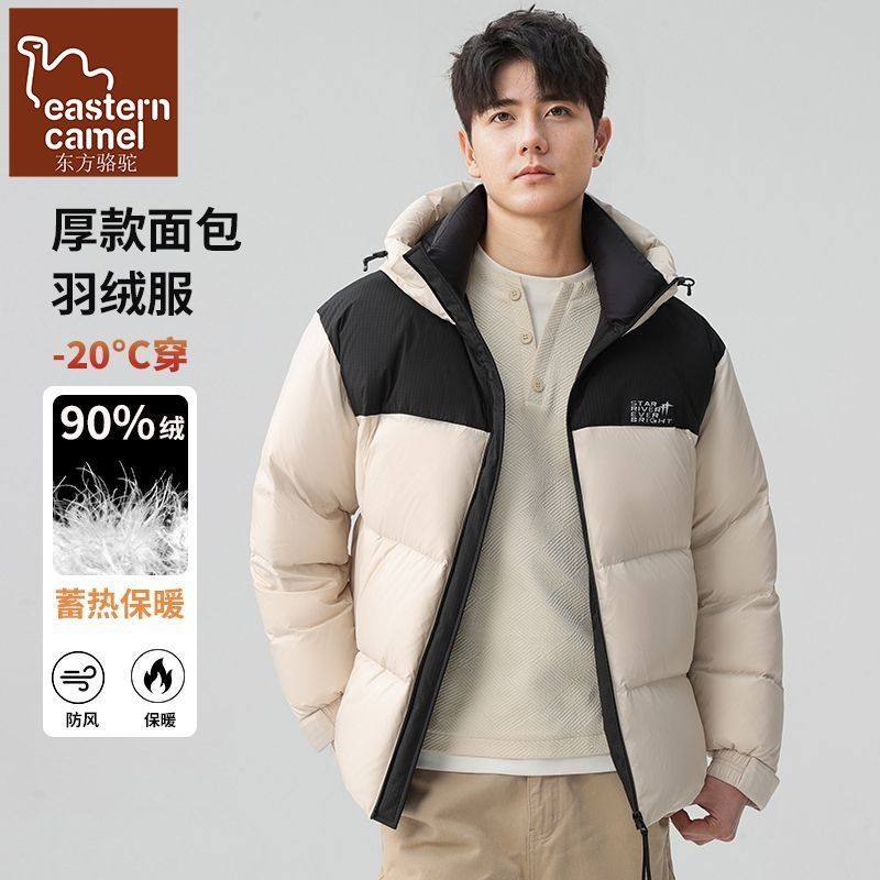 东方骆驼男士羽绒服连帽短款加厚鸭绒保暖运动户外拼色面包服冬季