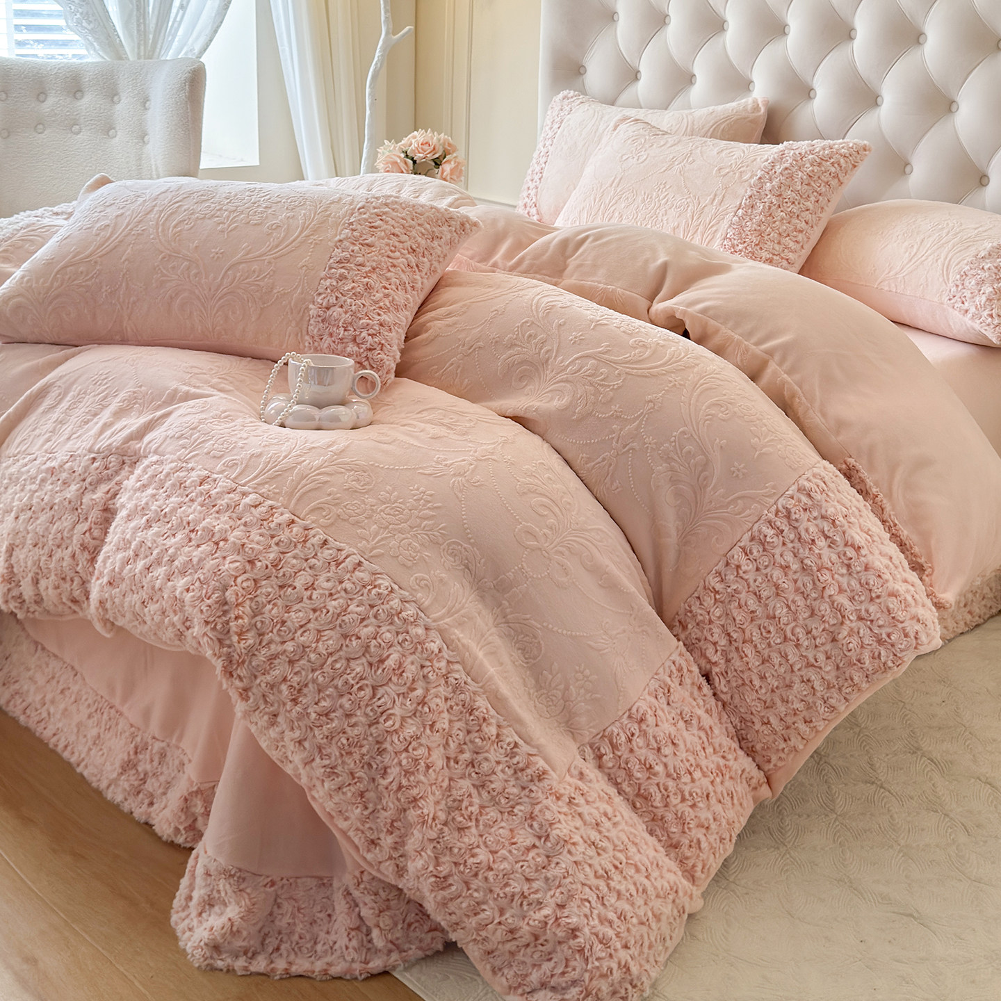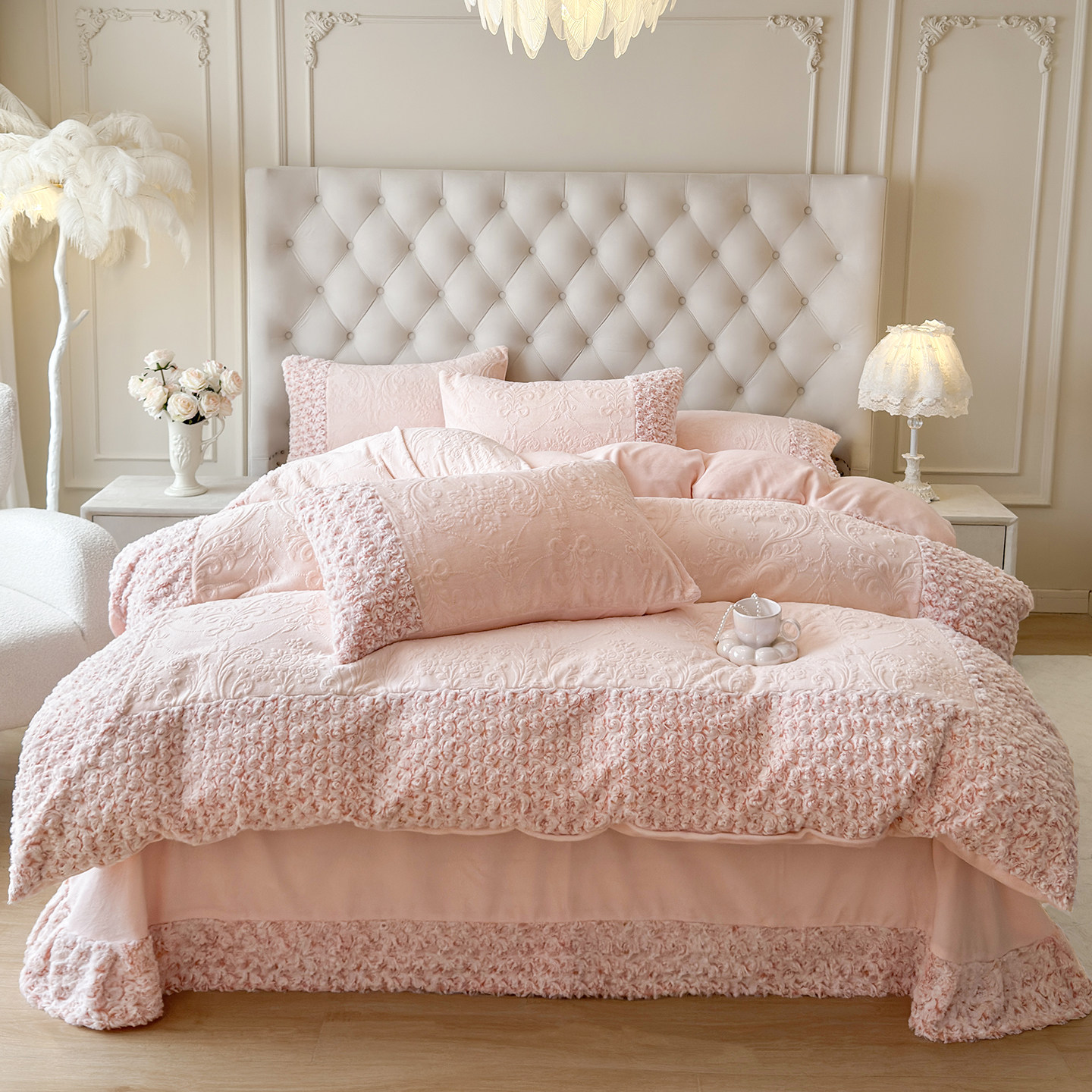 加厚雕花牛奶绒床上四件套花边床盖款2025新款冬季保暖珊瑚绒被套