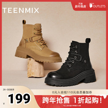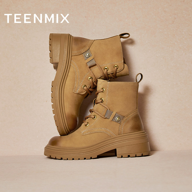 天美意复古英伦厚底马丁靴短靴女鞋大黄靴皮靴冬新款KDX01DD4