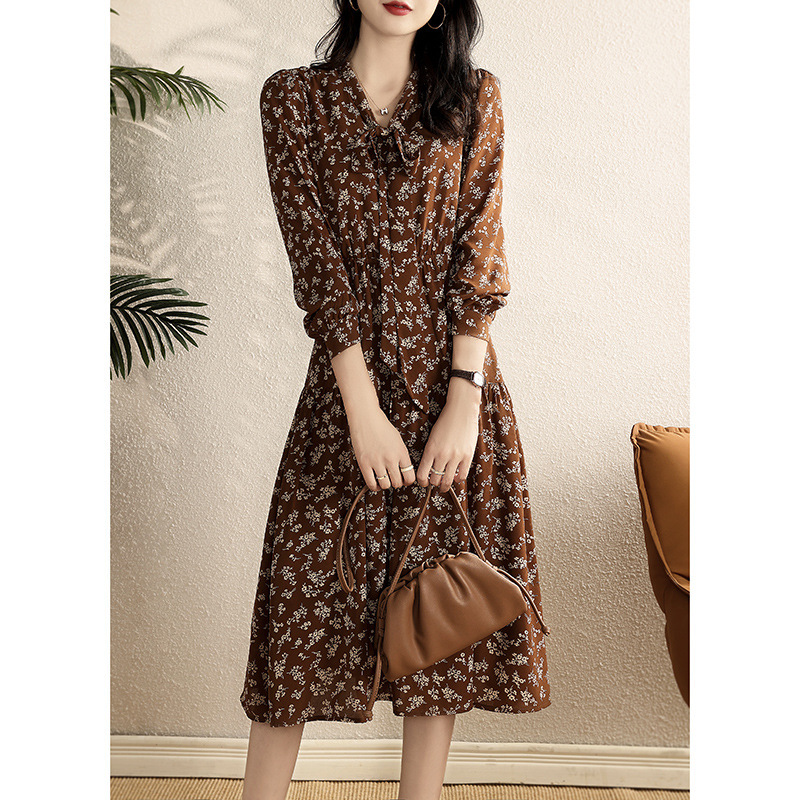 法式复古小碎花连衣裙女2025春秋新款v领收腰显瘦长款感裙子