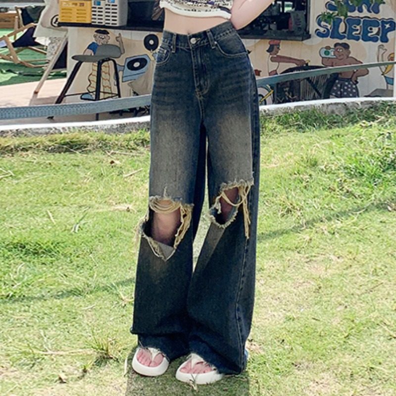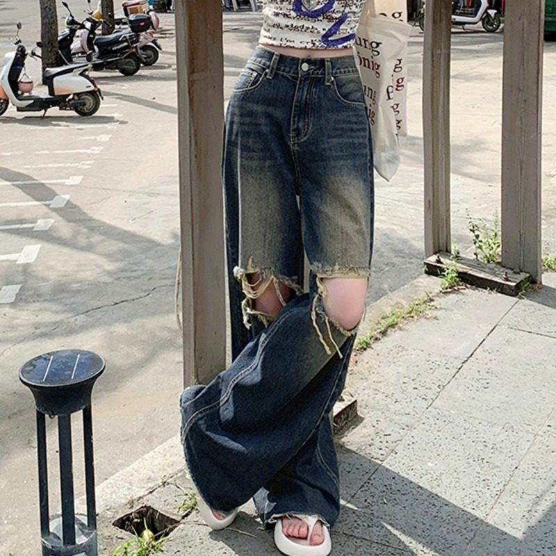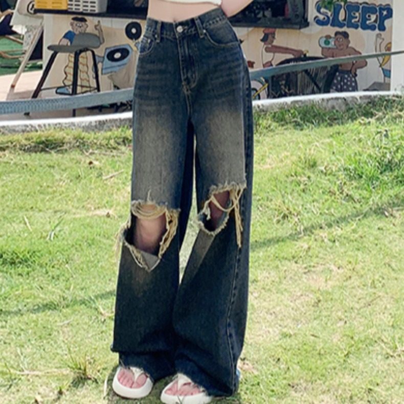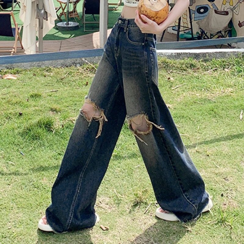 小个子破洞牛仔裤女夏季2025年新款高腰修身阔腿裤子宽松bf慵懒风