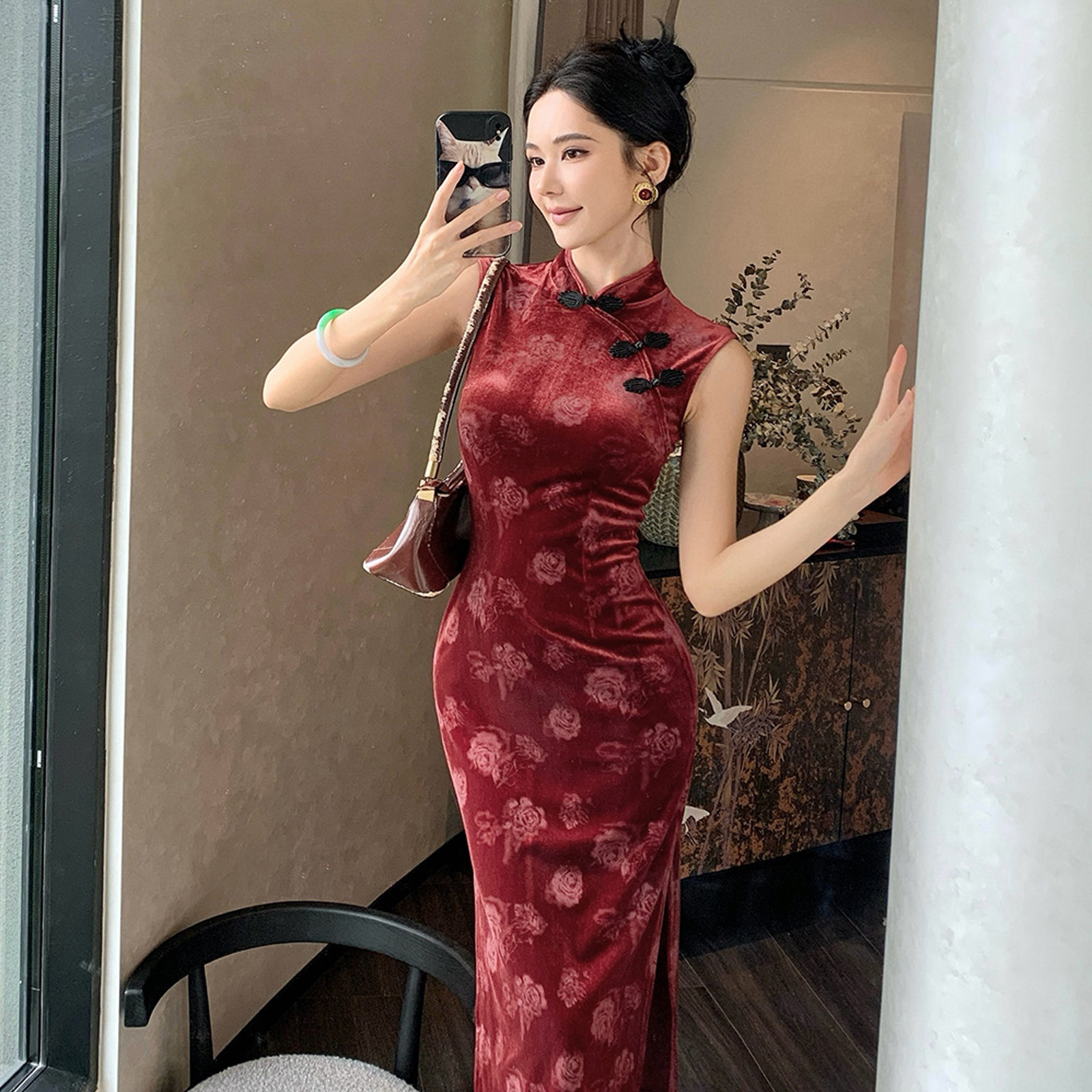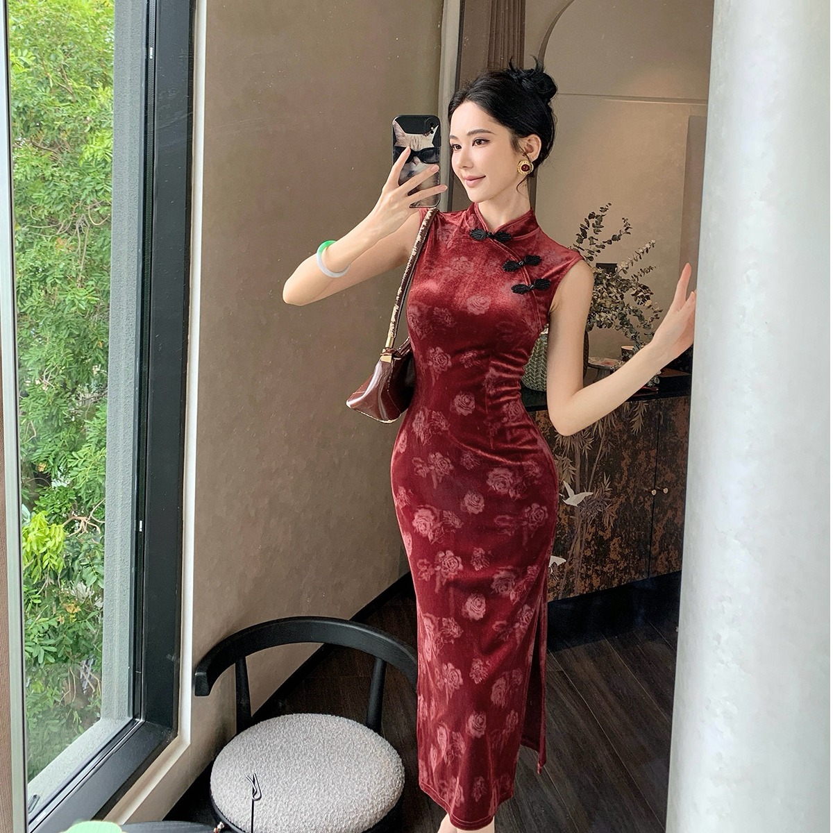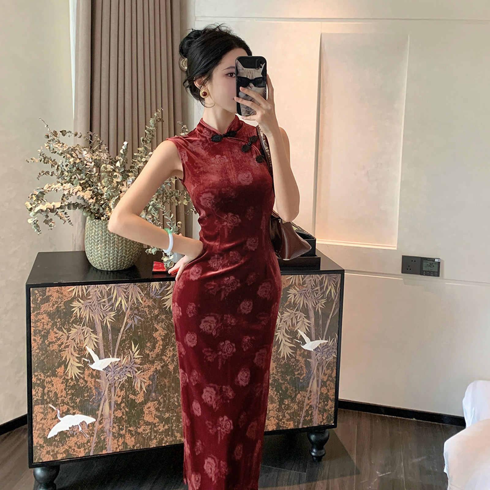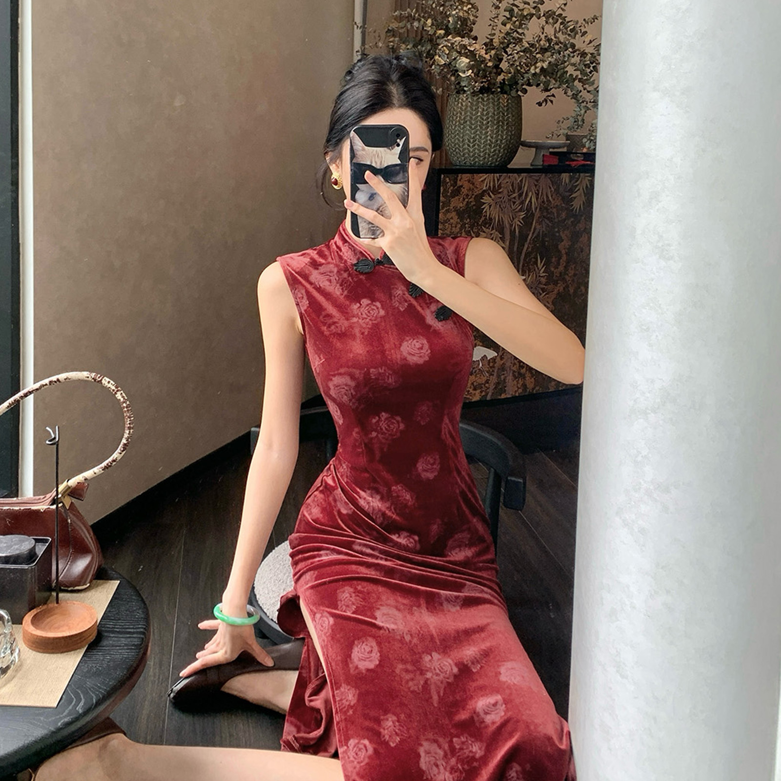 新中式国风改良旗袍长裙辣妹性感开叉包臀印花连衣裙红色新年穿搭