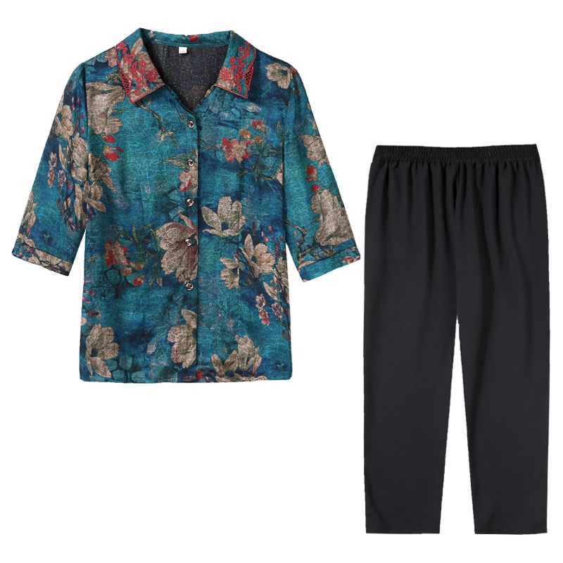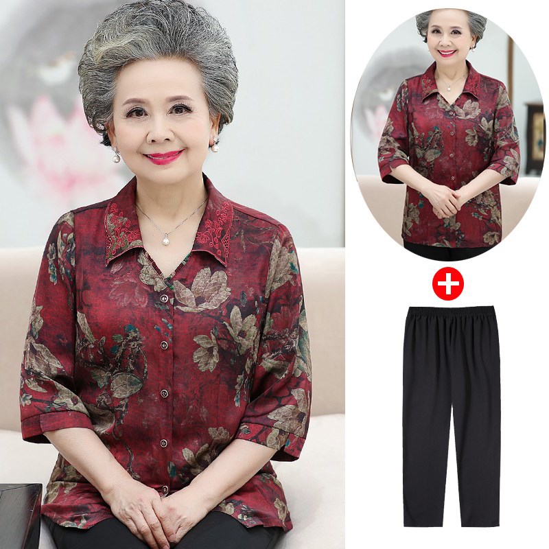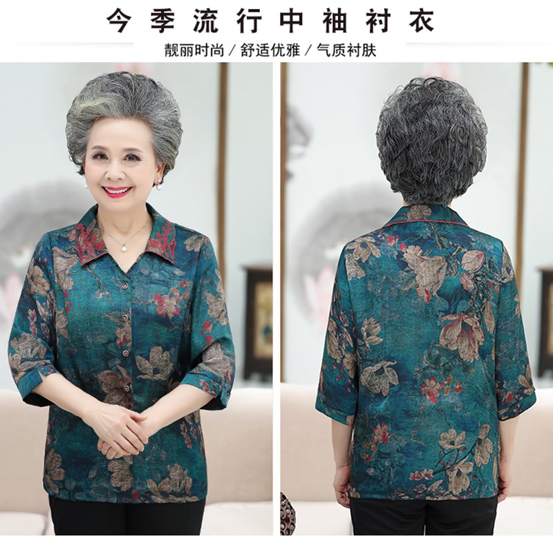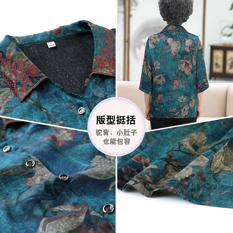 老年人春夏装真丝衬衫女60岁70妈妈款太太中袖衬衣80婆婆奶奶套装