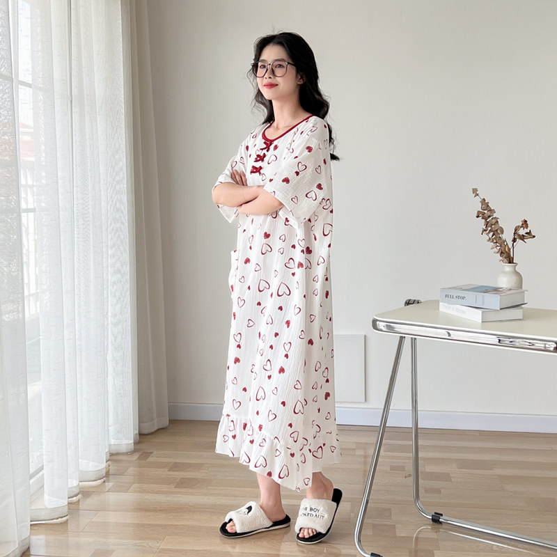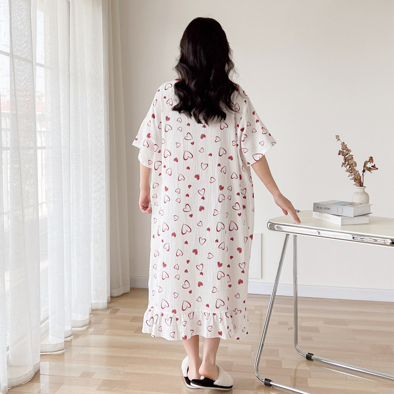 夏季爱心短袖薄款圆领纯棉纱布大码胖mm睡裙女宽松孕妇睡衣家居服
