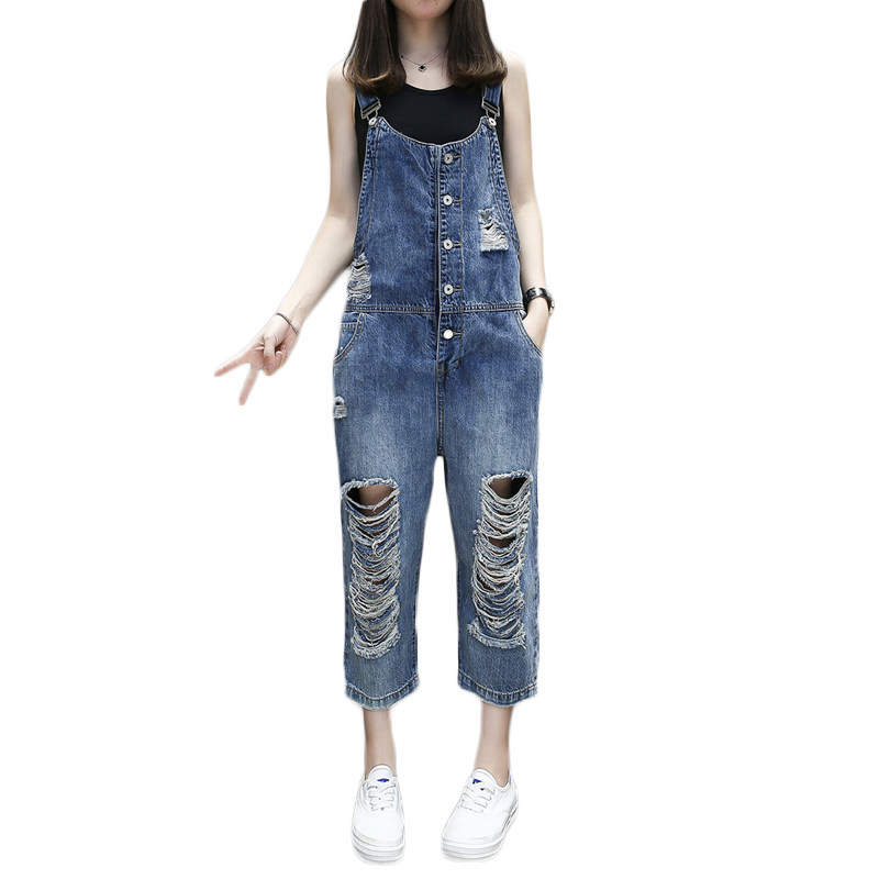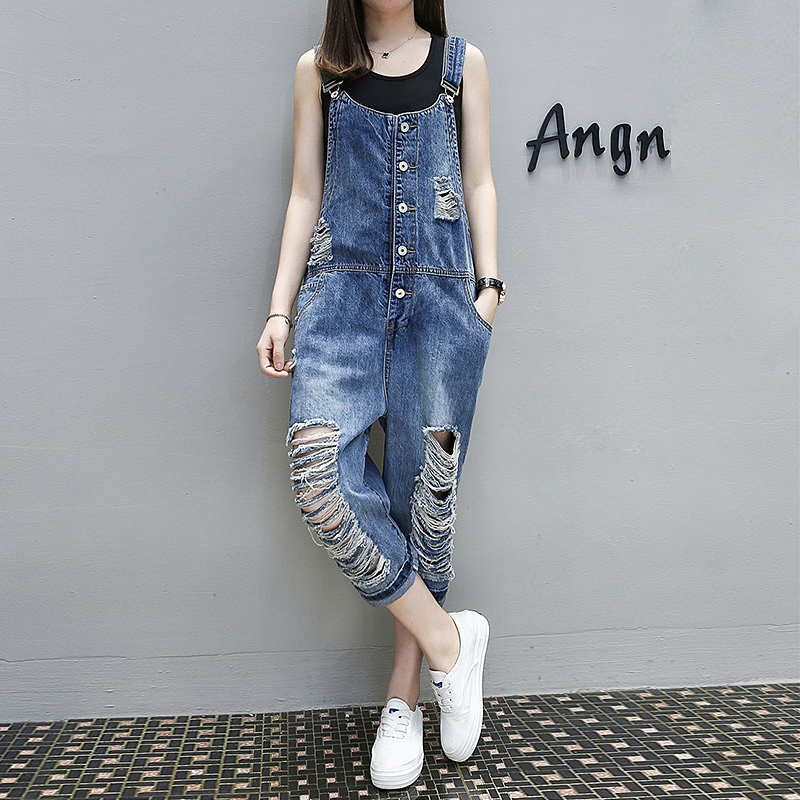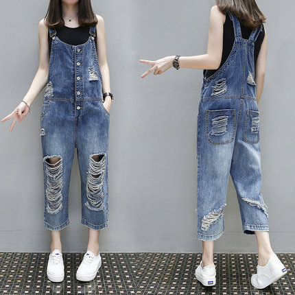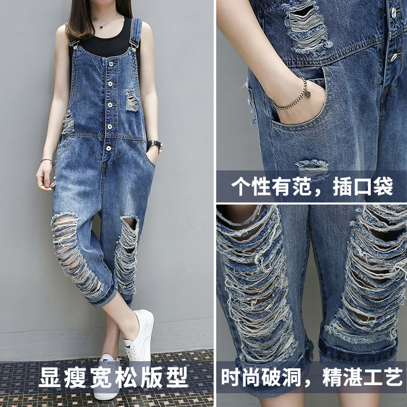 欧洲站潮牌女装春秋新款牛仔裤休闲破洞显瘦垮裤韩版女九分背带裤