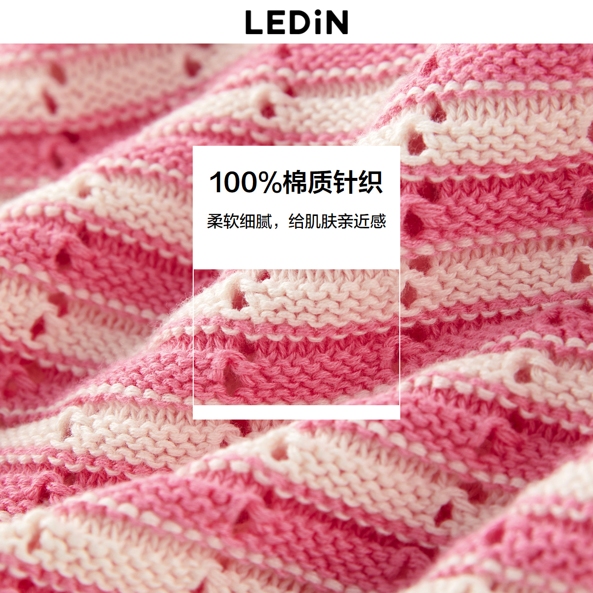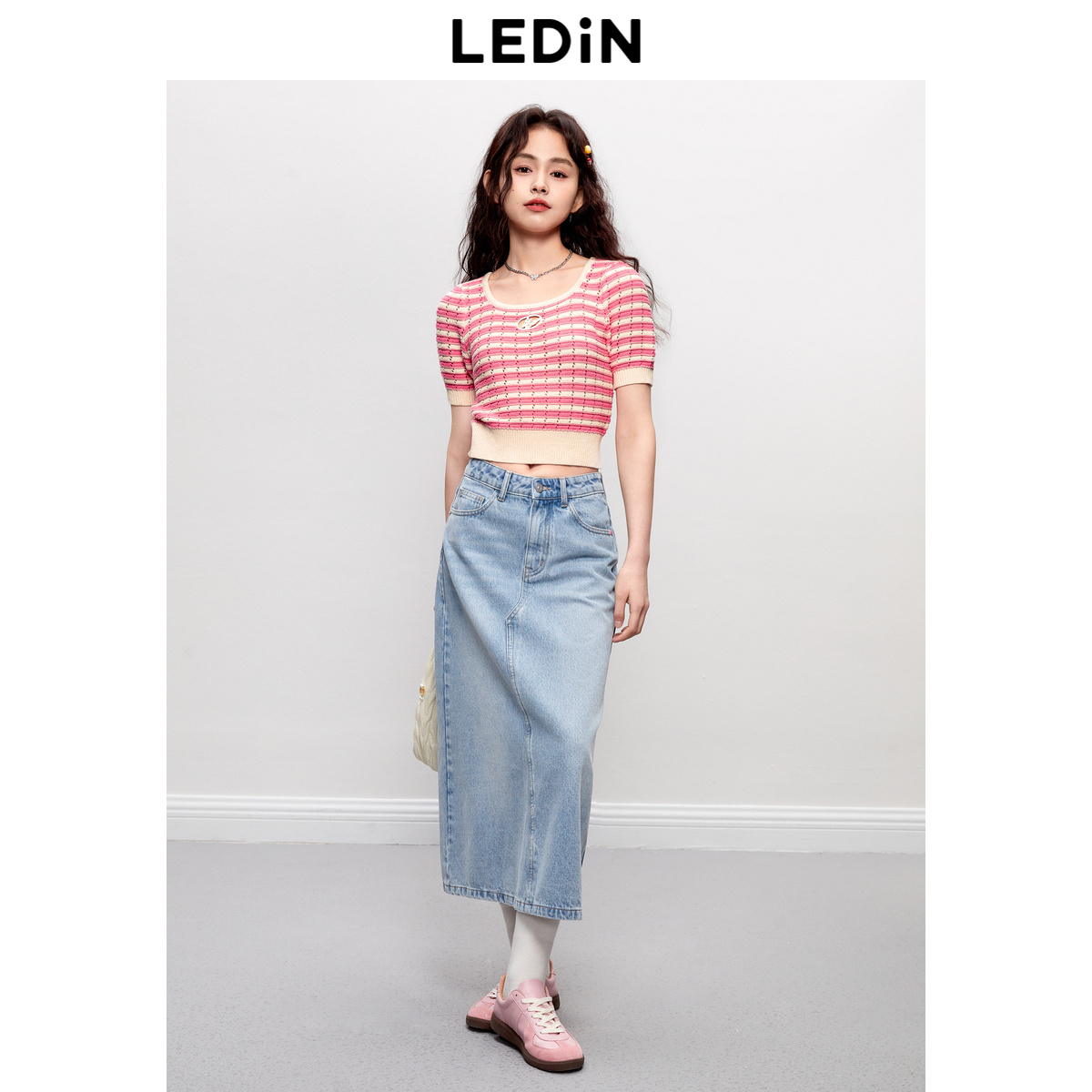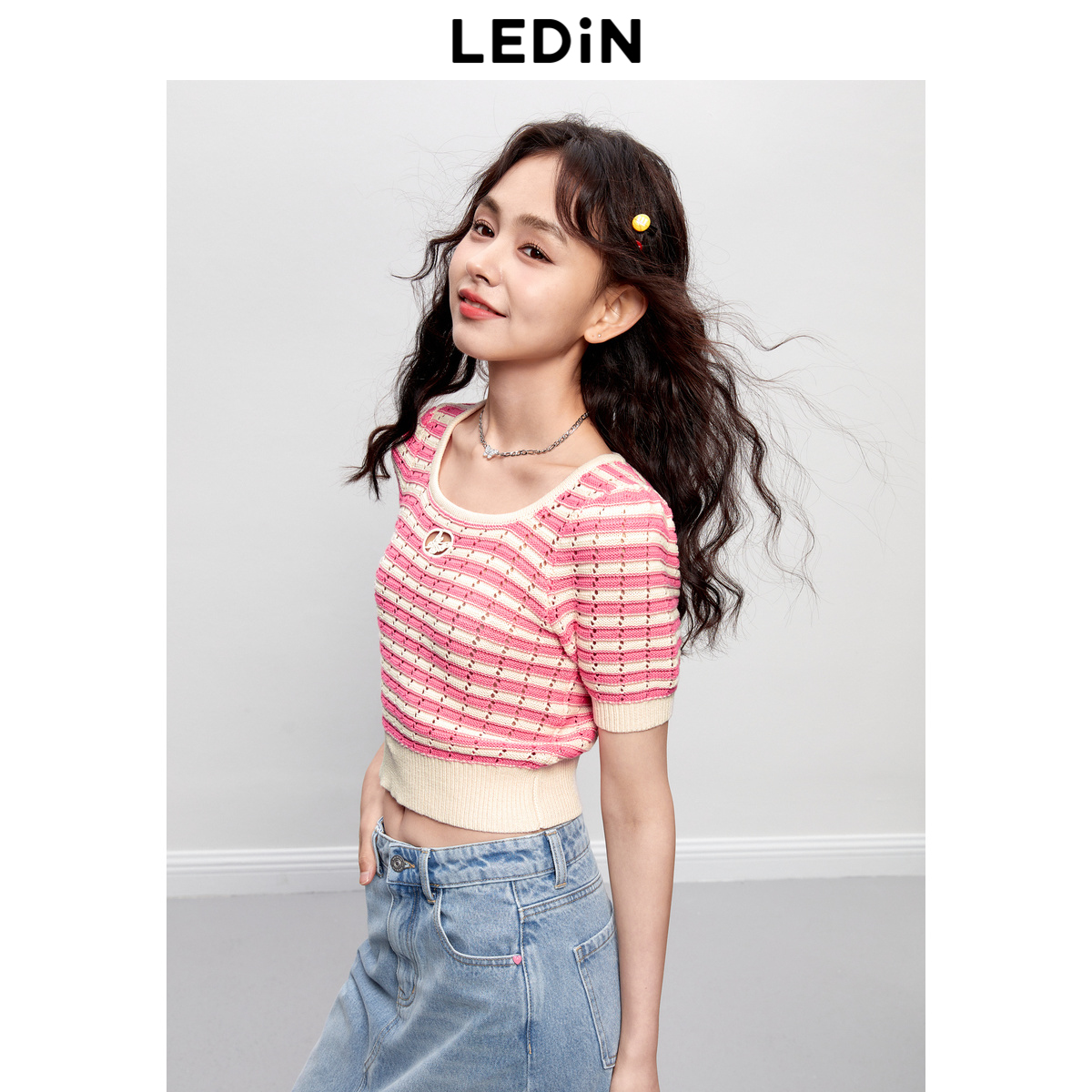 【断码清仓】乐町新品U领条纹短袖针织上衣女镂空多巴胺短针织衫