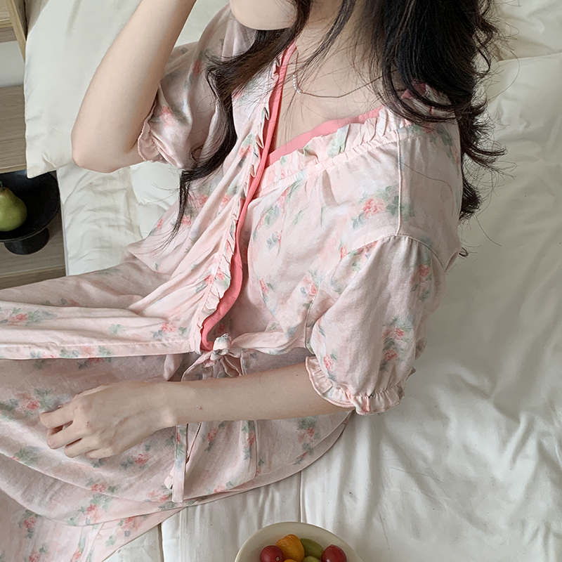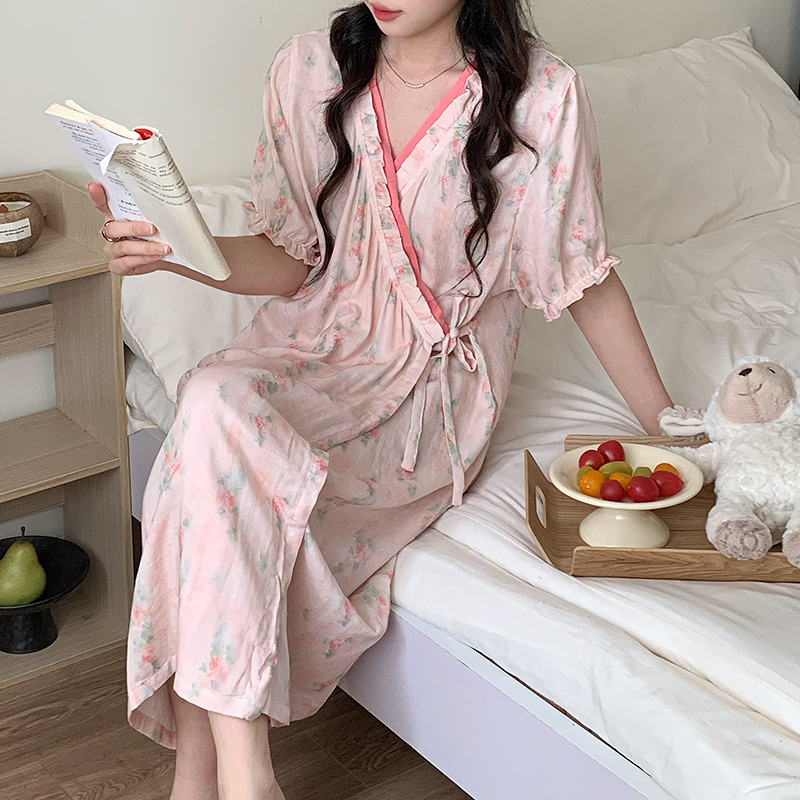 国风睡裙女夏季纯棉纱布短袖女士夏天碎花桔梗家居服睡袍中式睡衣