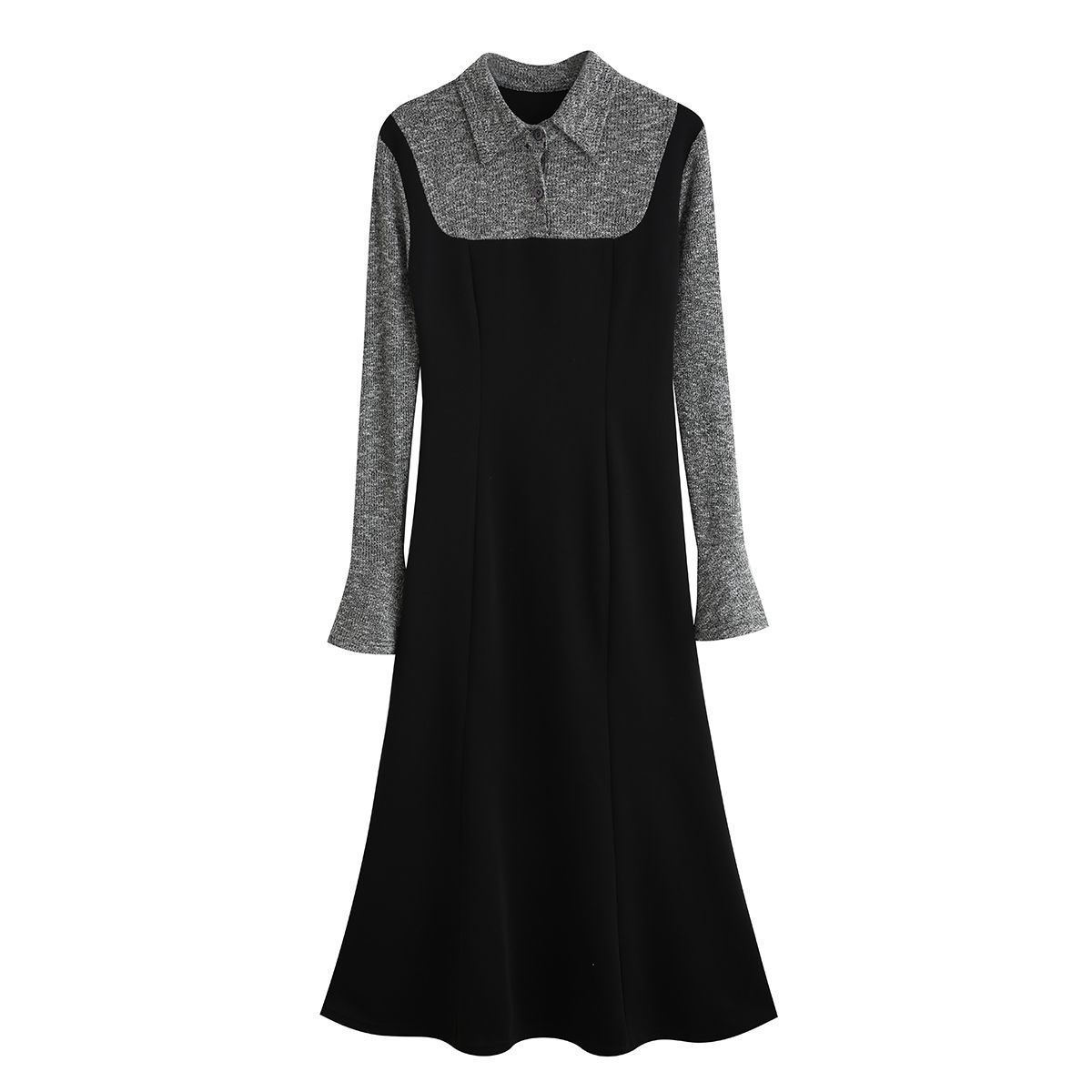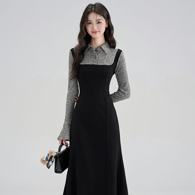 学院风温柔黑色衬衫领长袖假两件连衣裙女2025秋冬polo领修身长裙