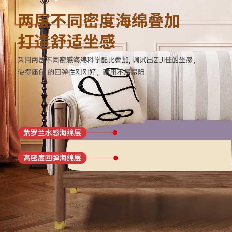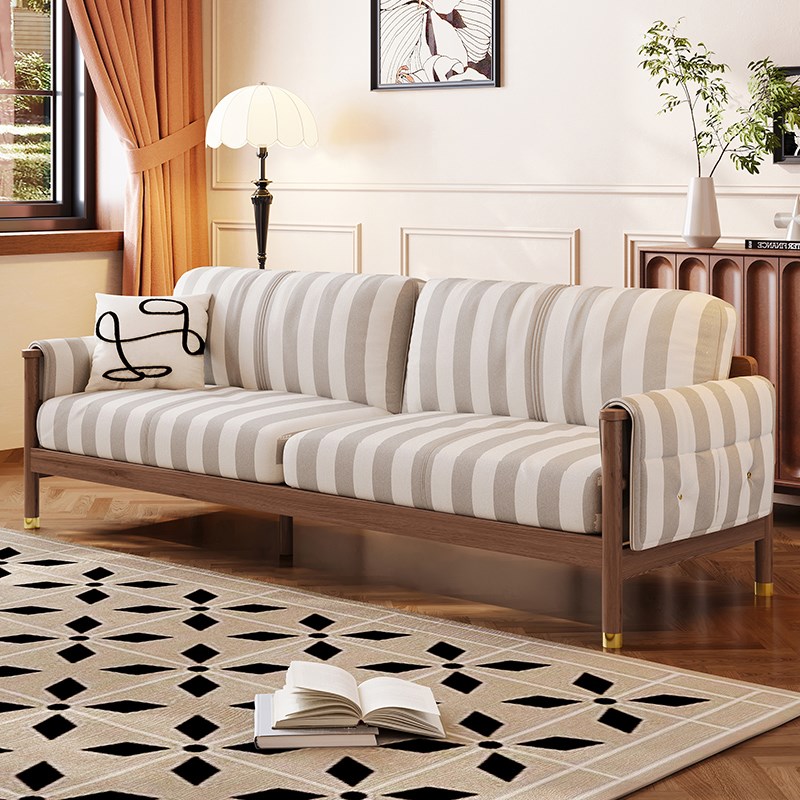北欧实木沙发白蜡木小户型客厅复古风直排三人可拆洗条纹布艺沙发
