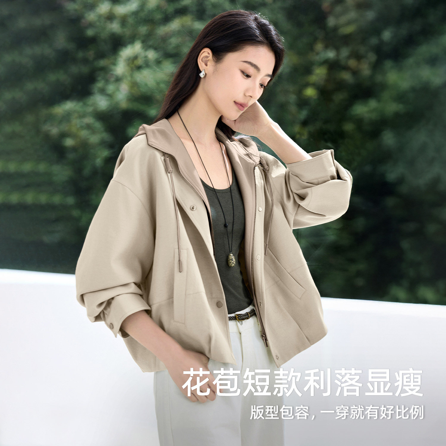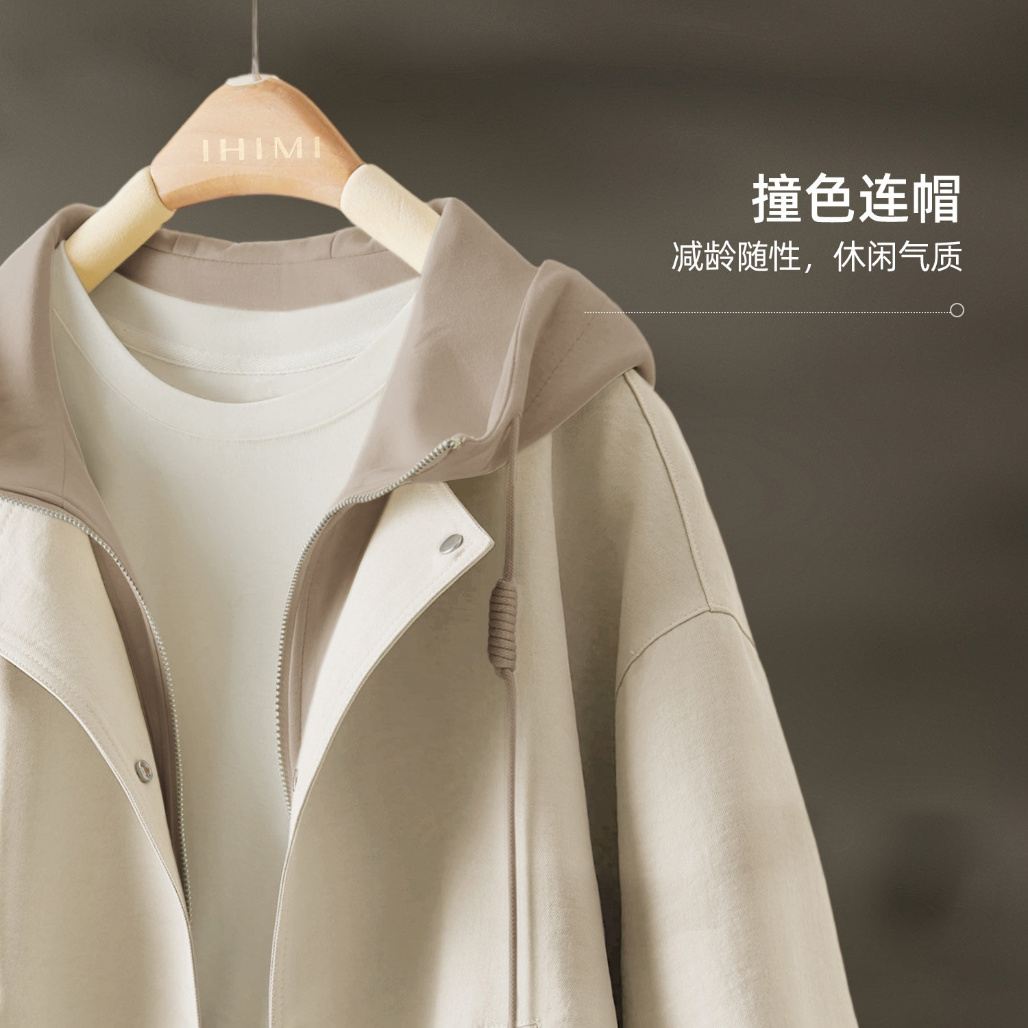 IHIMI海谧花苞型立翻领假两件连帽短款风衣女款春季新款夹克外套
