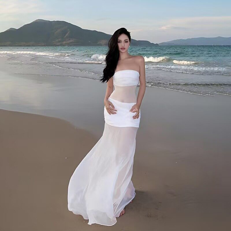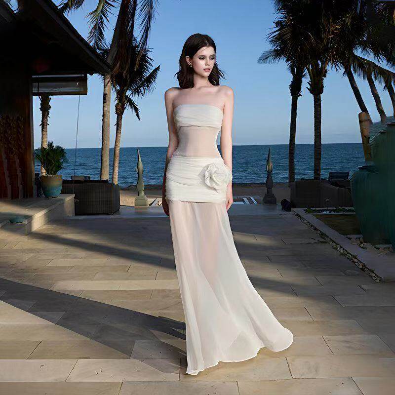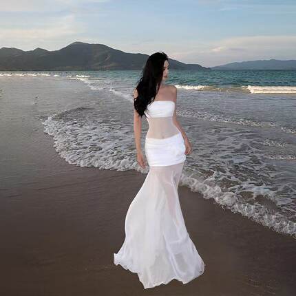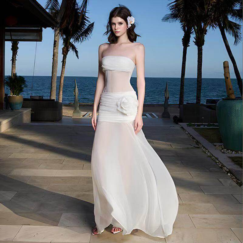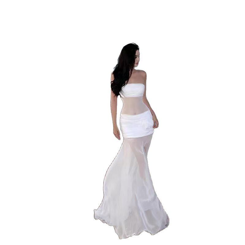 海边度假气质包臀长裙法式纯欲御姐透视白色网纱花朵抹胸连衣裙