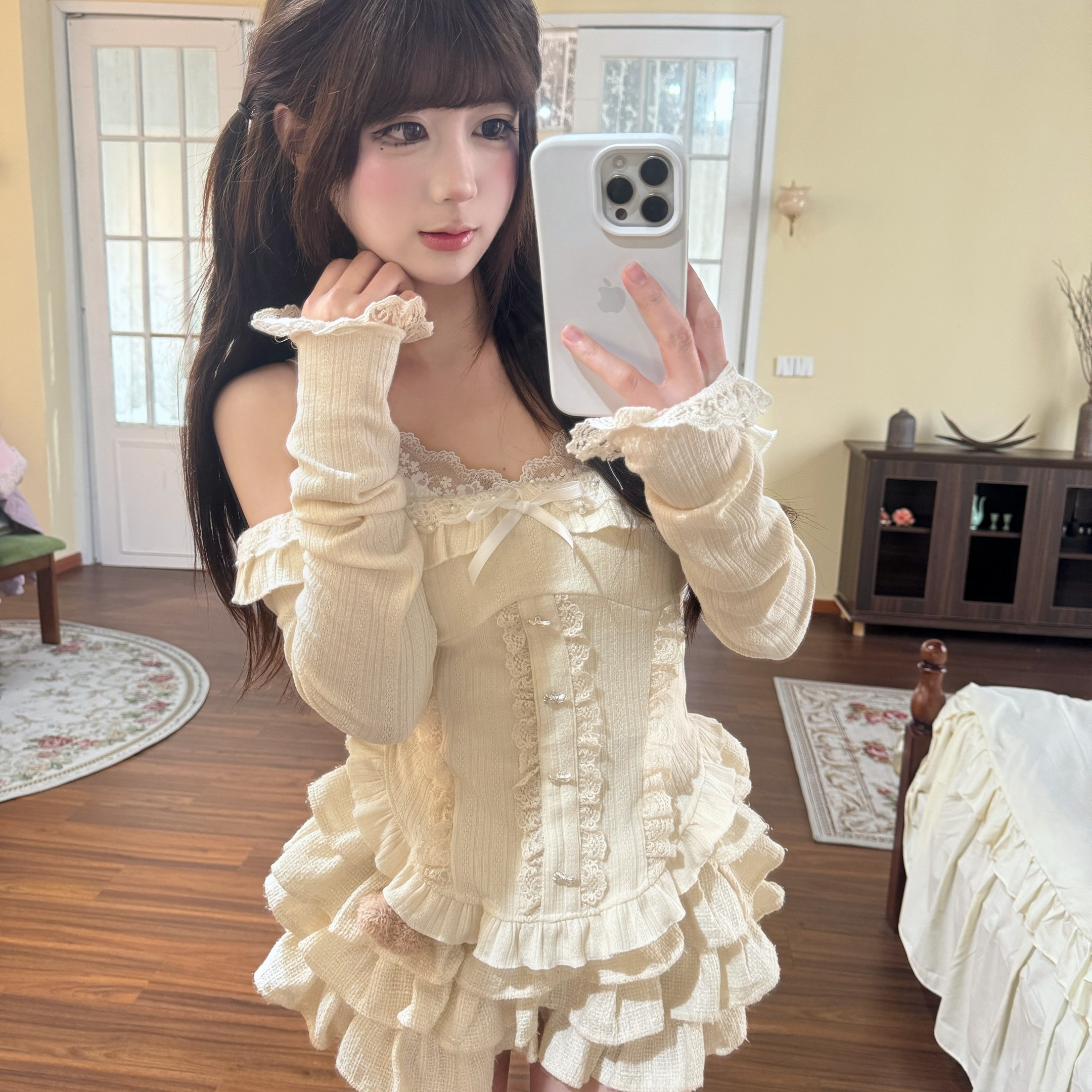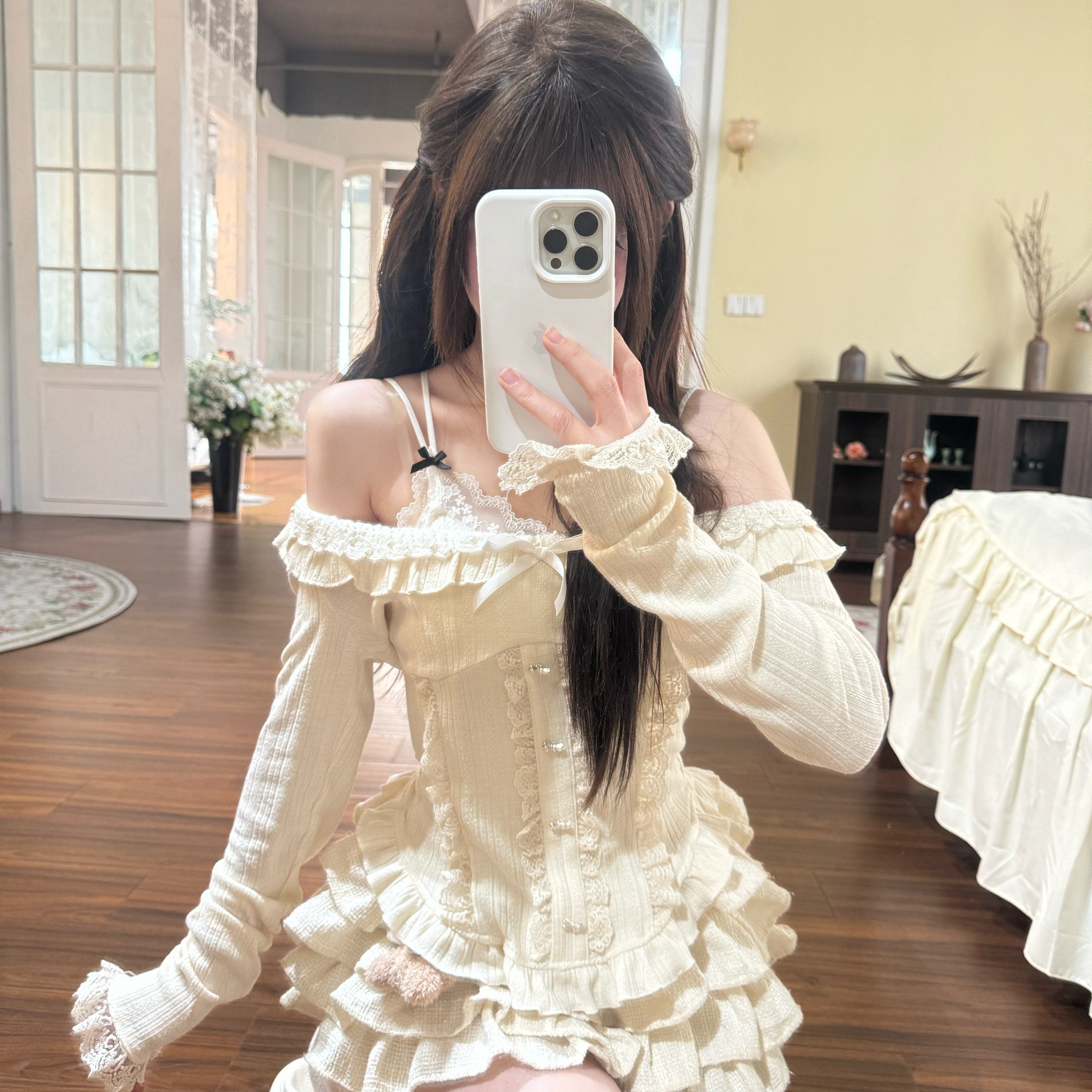 【小蚊同学】云朵泡芙纯欲风一字肩针织上衣+蕾丝吊带背心+蛋糕裙