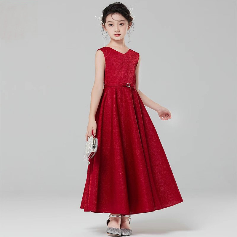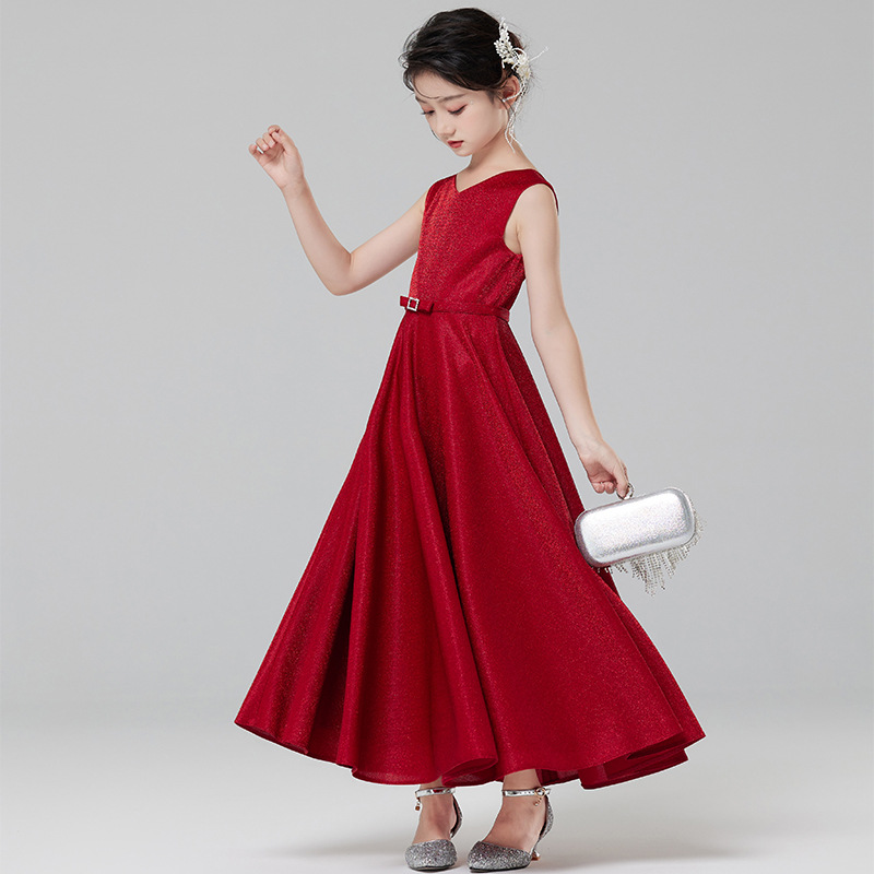 儿童红色礼服连衣裙女童无袖V领背心公主长裙子时尚长款演出服装