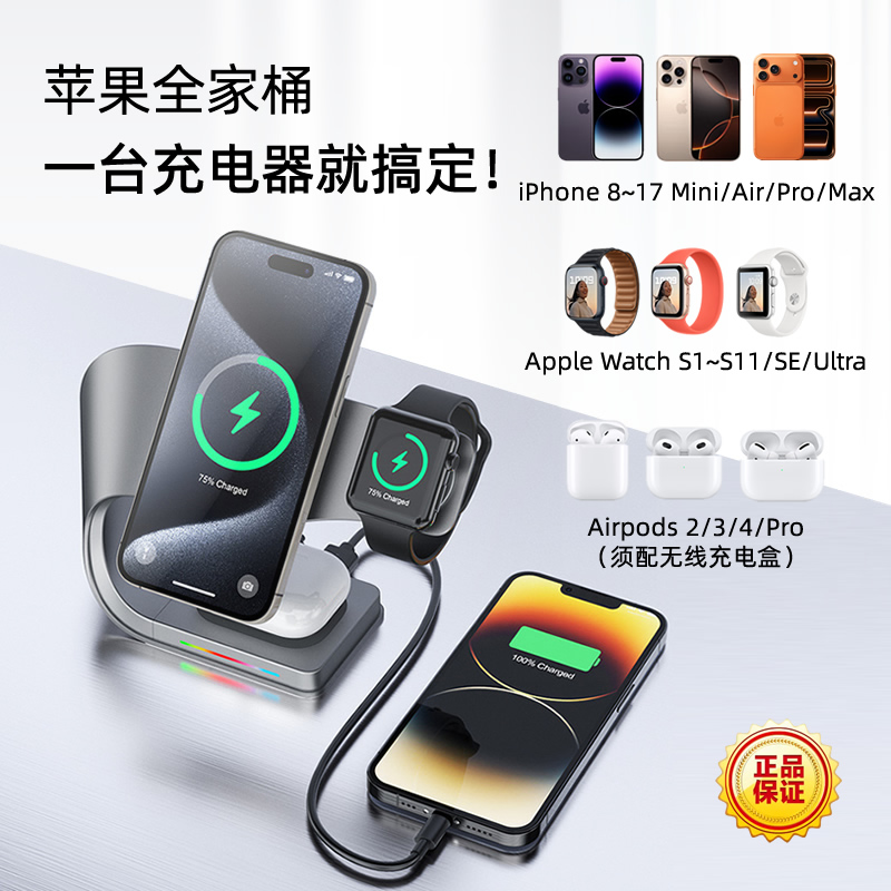 三合一磁吸无线充电器底座立式桌面支架适用苹果16iPhone17promax手表iwatch耳机airpods朋友公司年会礼品