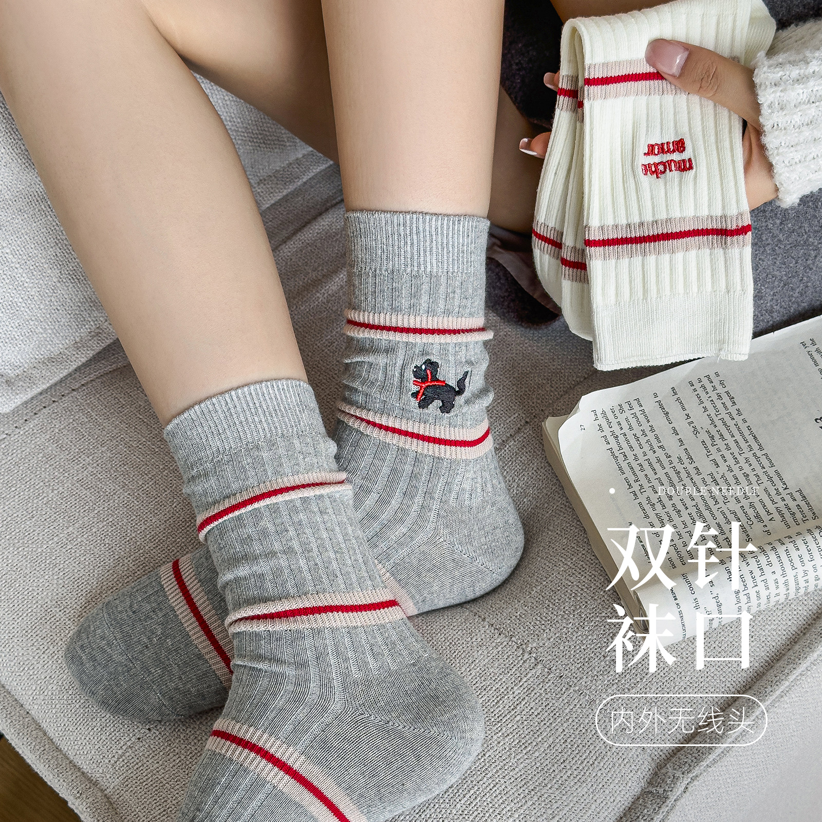 纯棉袜子女款秋冬季白色条纹中筒袜ins潮可爱小狗堆堆长袜无骨袜
