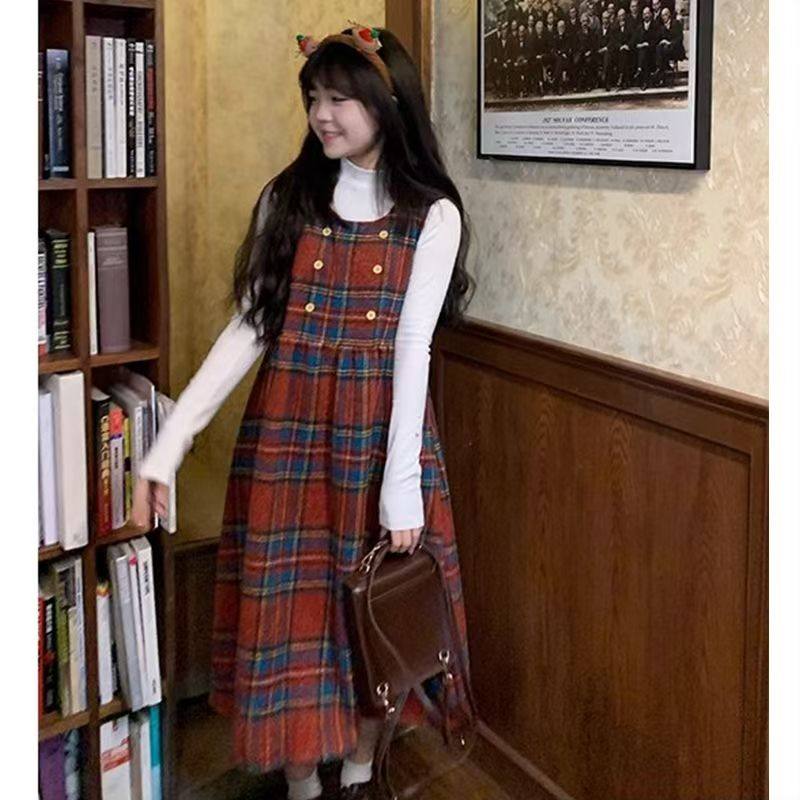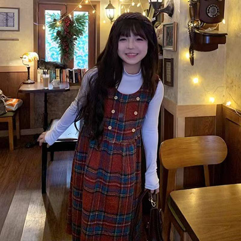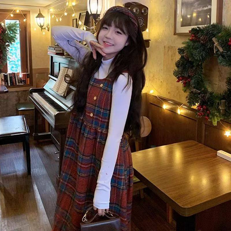 过年圣诞红色时尚复古格纹背带裙秋冬学生绑带收腰显瘦连衣裙套装