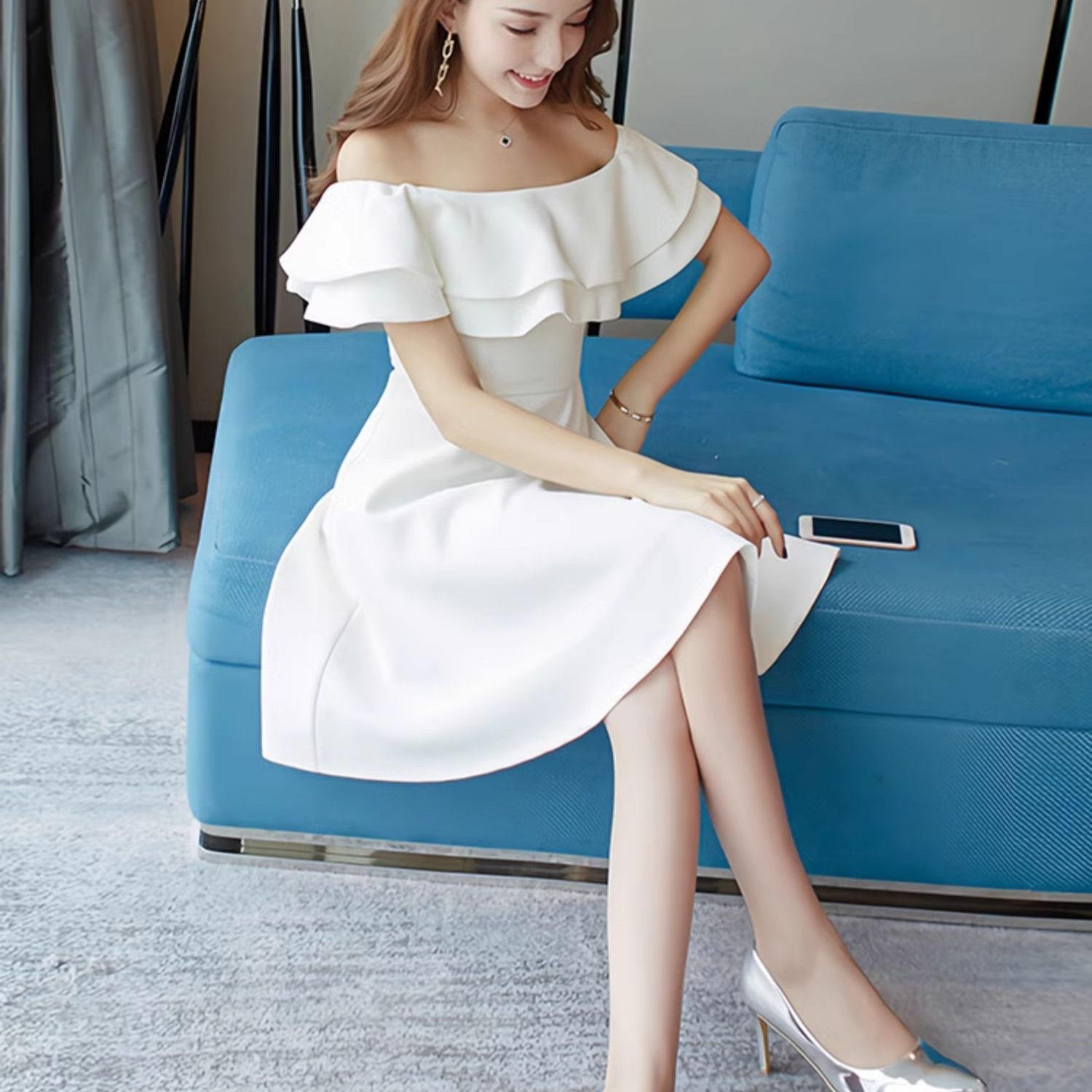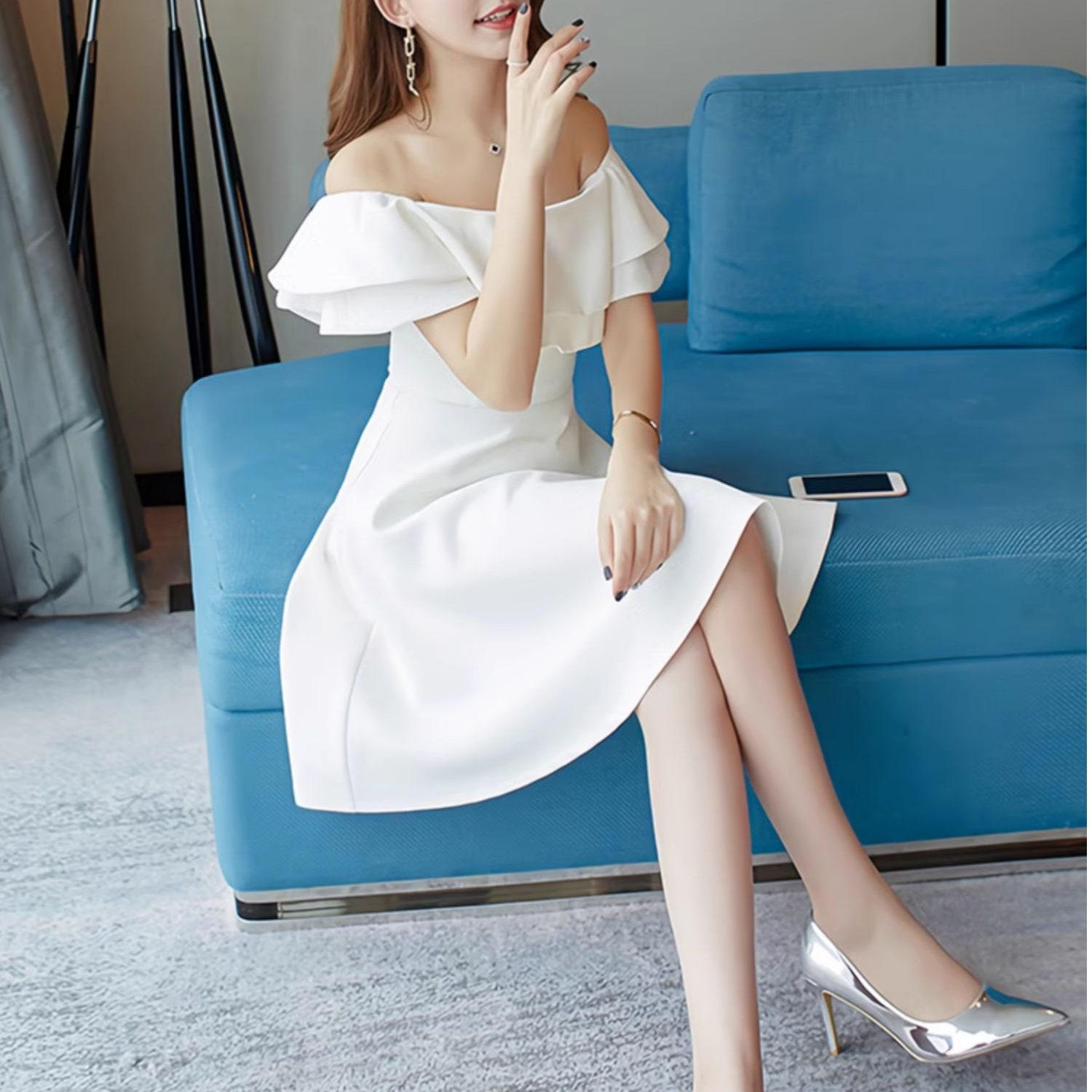 生日宴会小礼服女夏季高端精致名媛气质法式白色一字肩收腰连衣裙