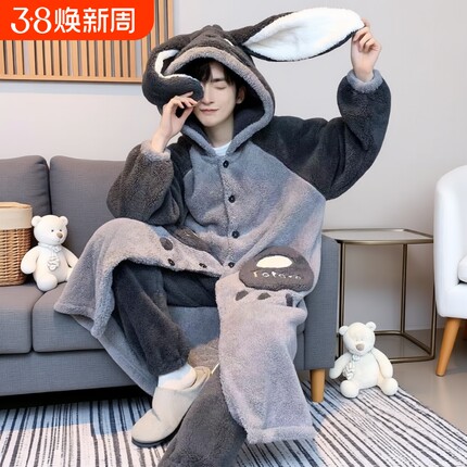缇男士秋冬季加厚珊瑚绒加绒特大码长款睡袍法兰绒家居服可外穿