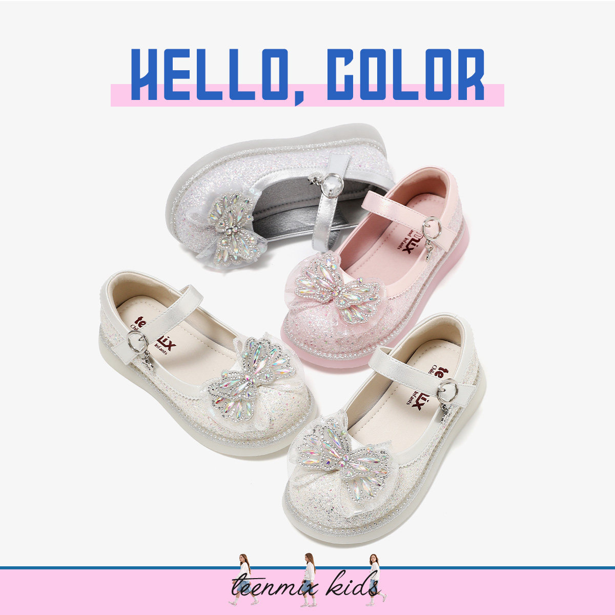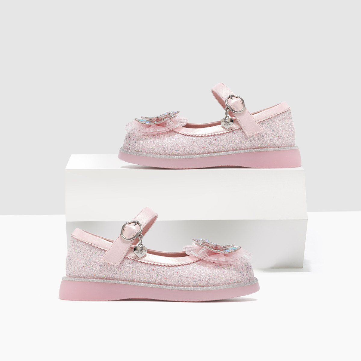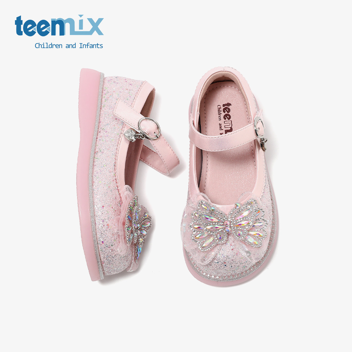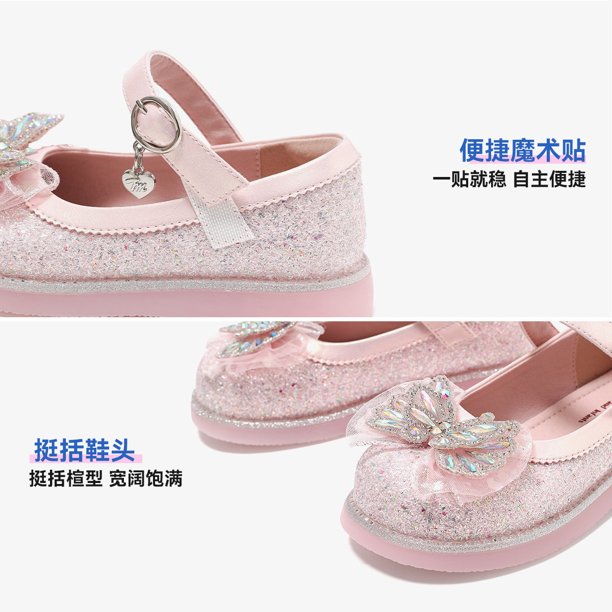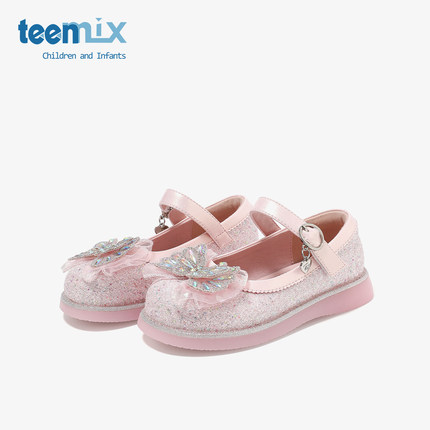 天美意童鞋2026春季新款女童水钻蝴蝶结时尚软底水晶鞋百搭公主鞋
