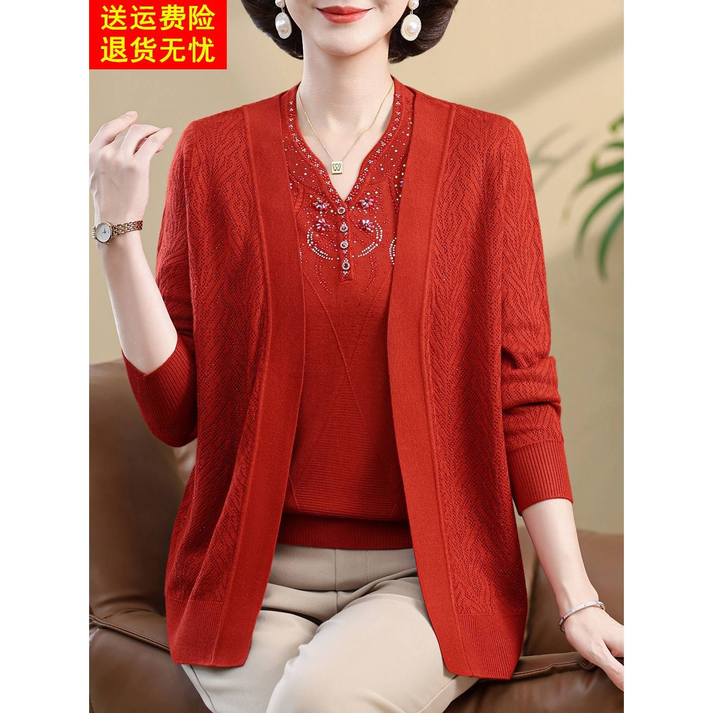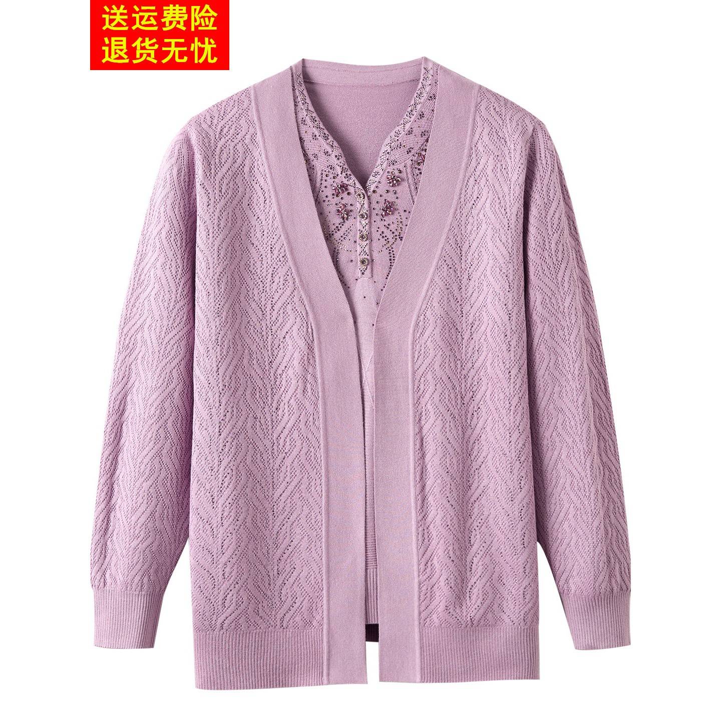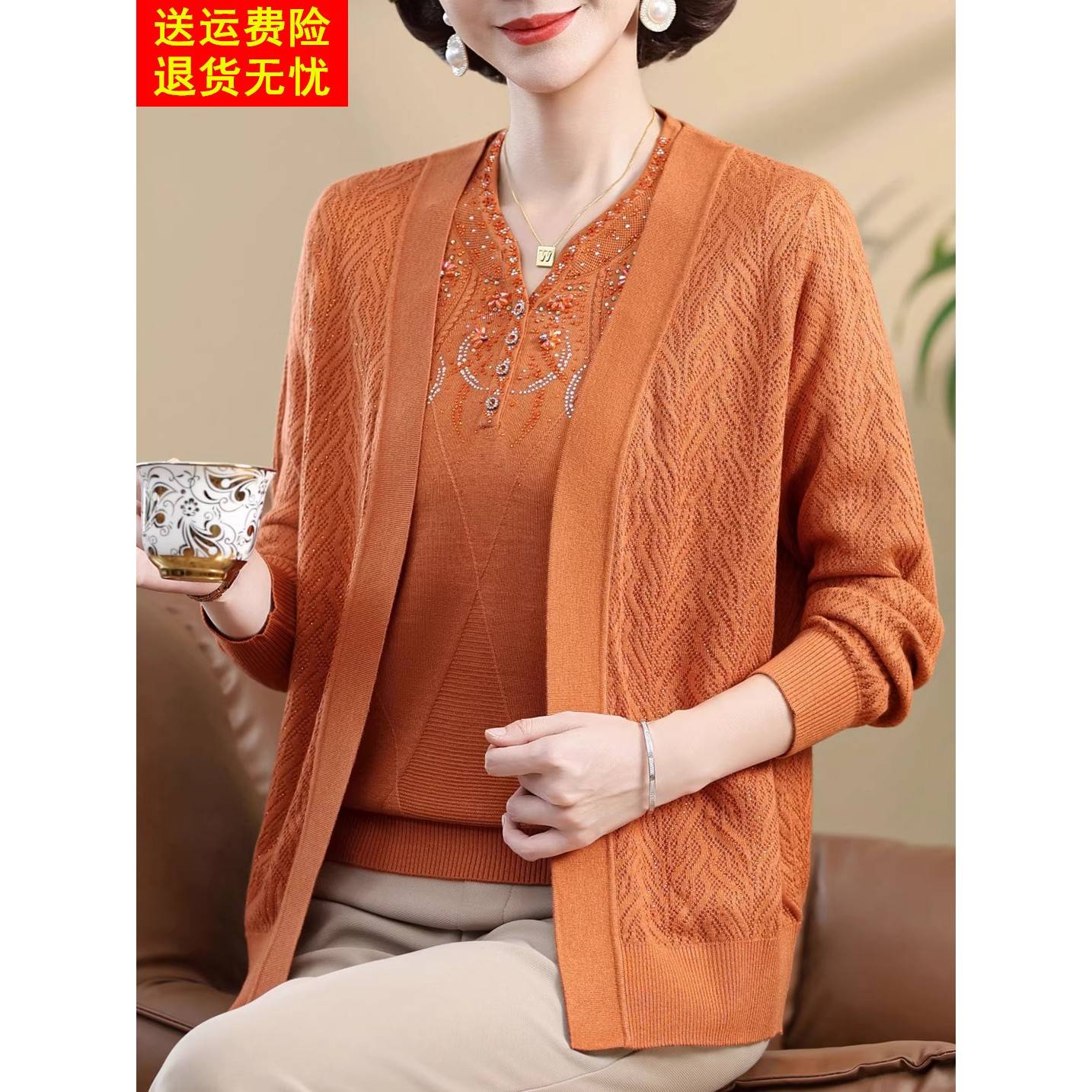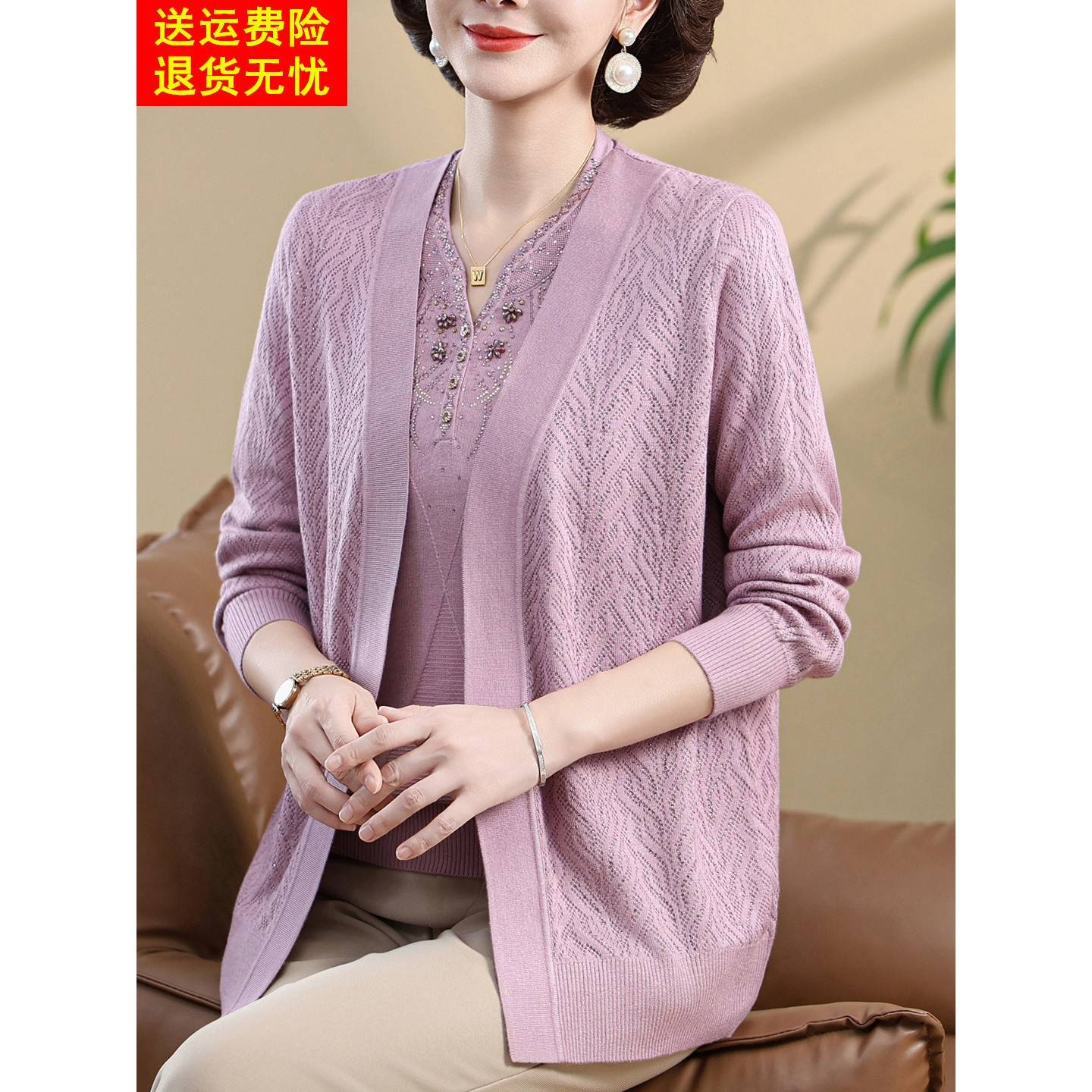 中老年妈妈秋装冰丝针织外套女加肥加大码高贵薄款上衣两件套开衫
