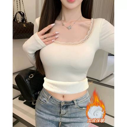 冬季加绒加厚长袖打底衫女蕾丝花边领修身内搭打底德绒保暖上衣潮
