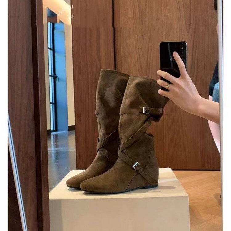 内增高5CM平底皮带扣复古堆堆西部牛仔靴圆头柔软褶皱显瘦中筒靴