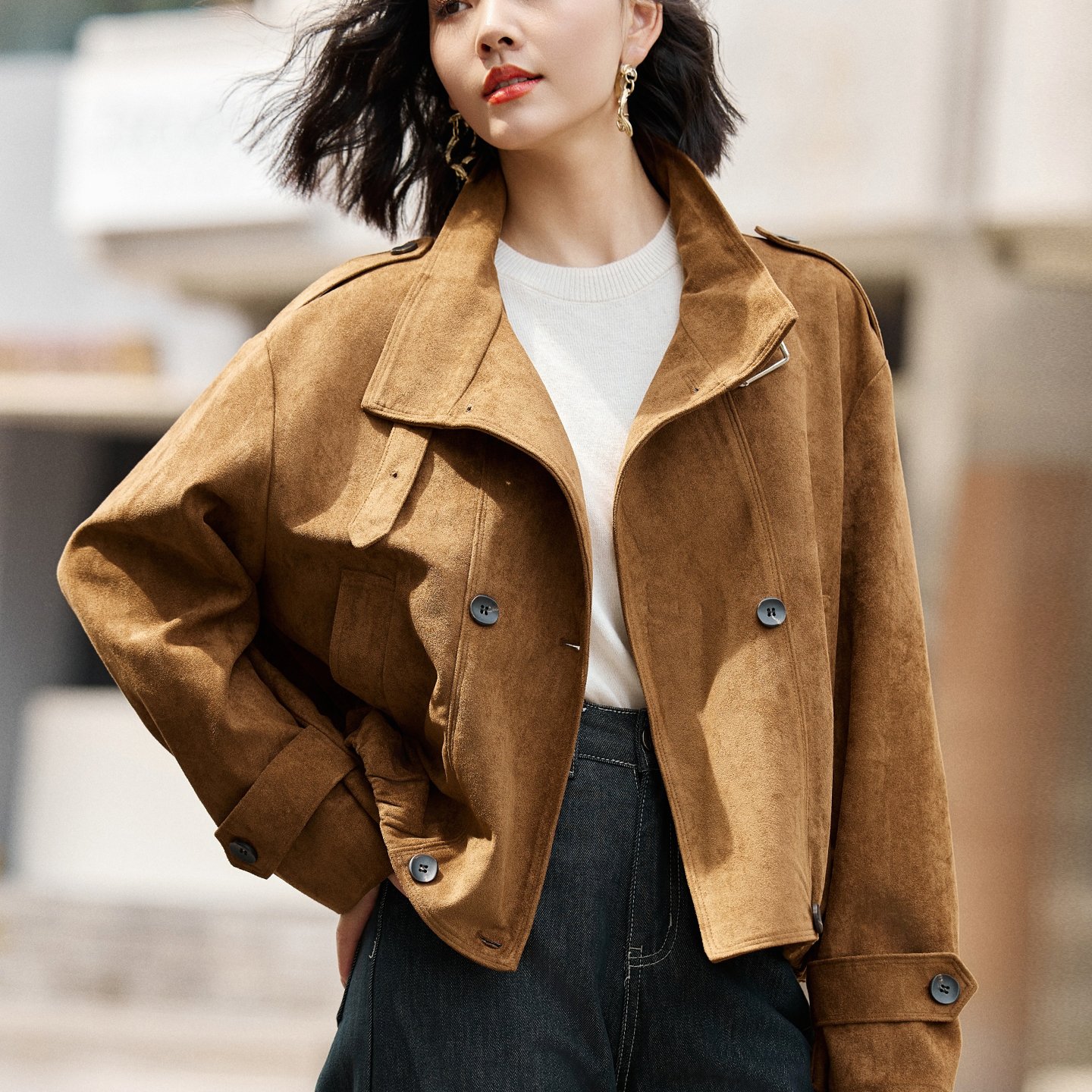 麂皮绒短款外套女秋2025新款高级感韩系休闲百搭复古机车夹克上衣