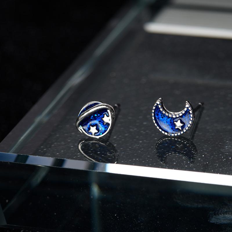 不对称蓝色宇宙月亮耳钉女ins风