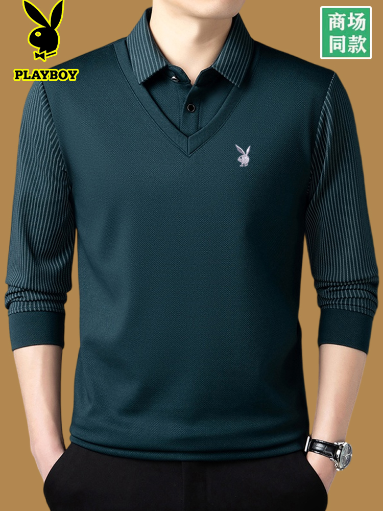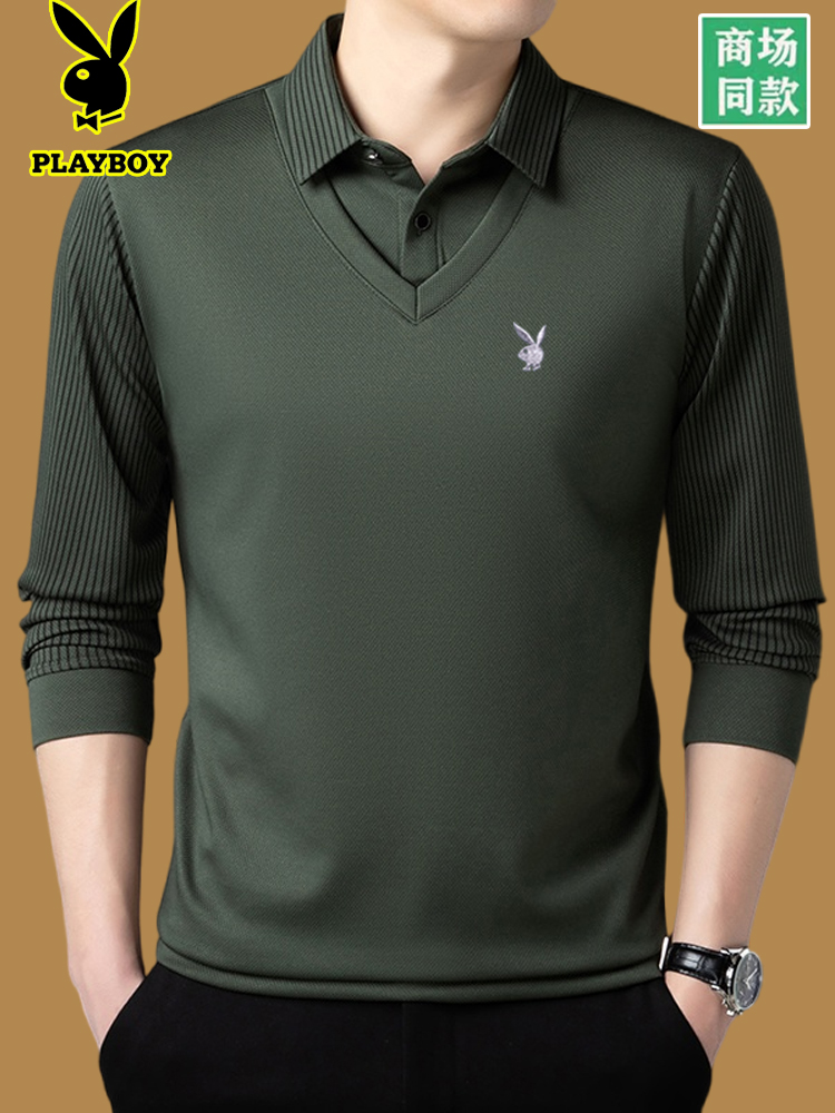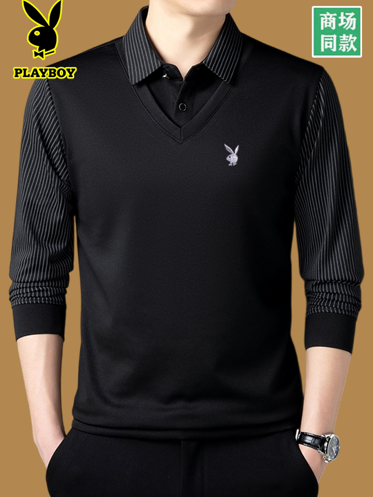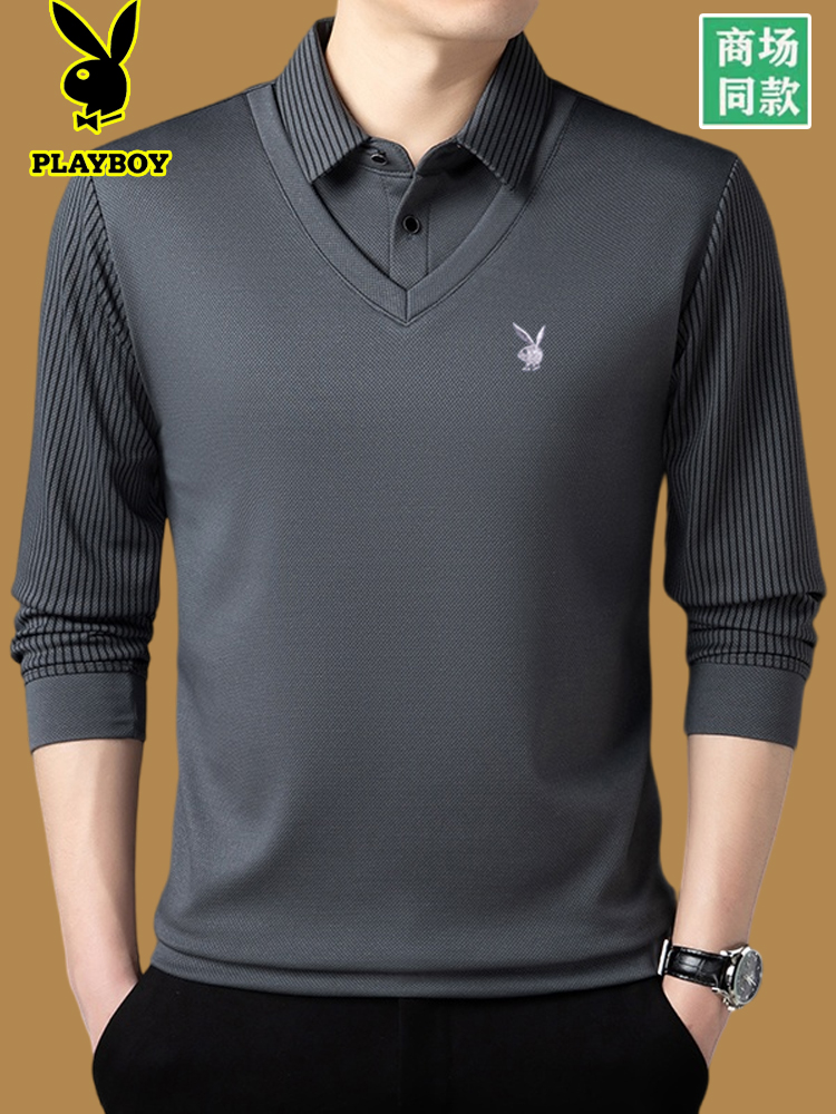 花花公子长袖t恤男士春秋款衬衫领假两件打底衫男装秋衣休闲上衣T