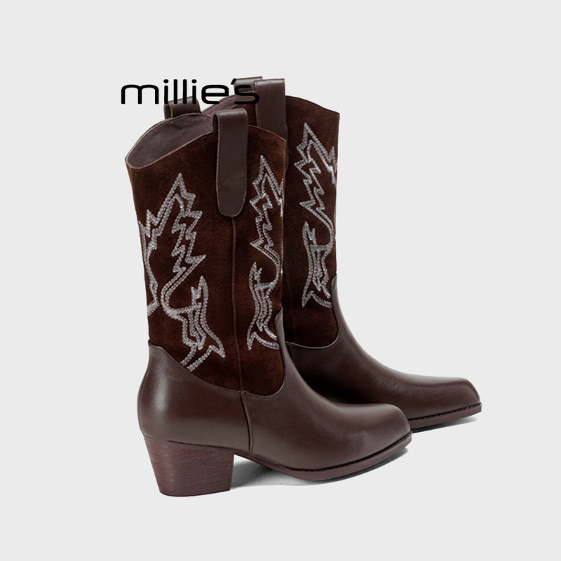 MILLIE'S/妙丽短筒西部牛仔靴女秋冬刺绣尖头中筒靴子中粗跟短靴Q