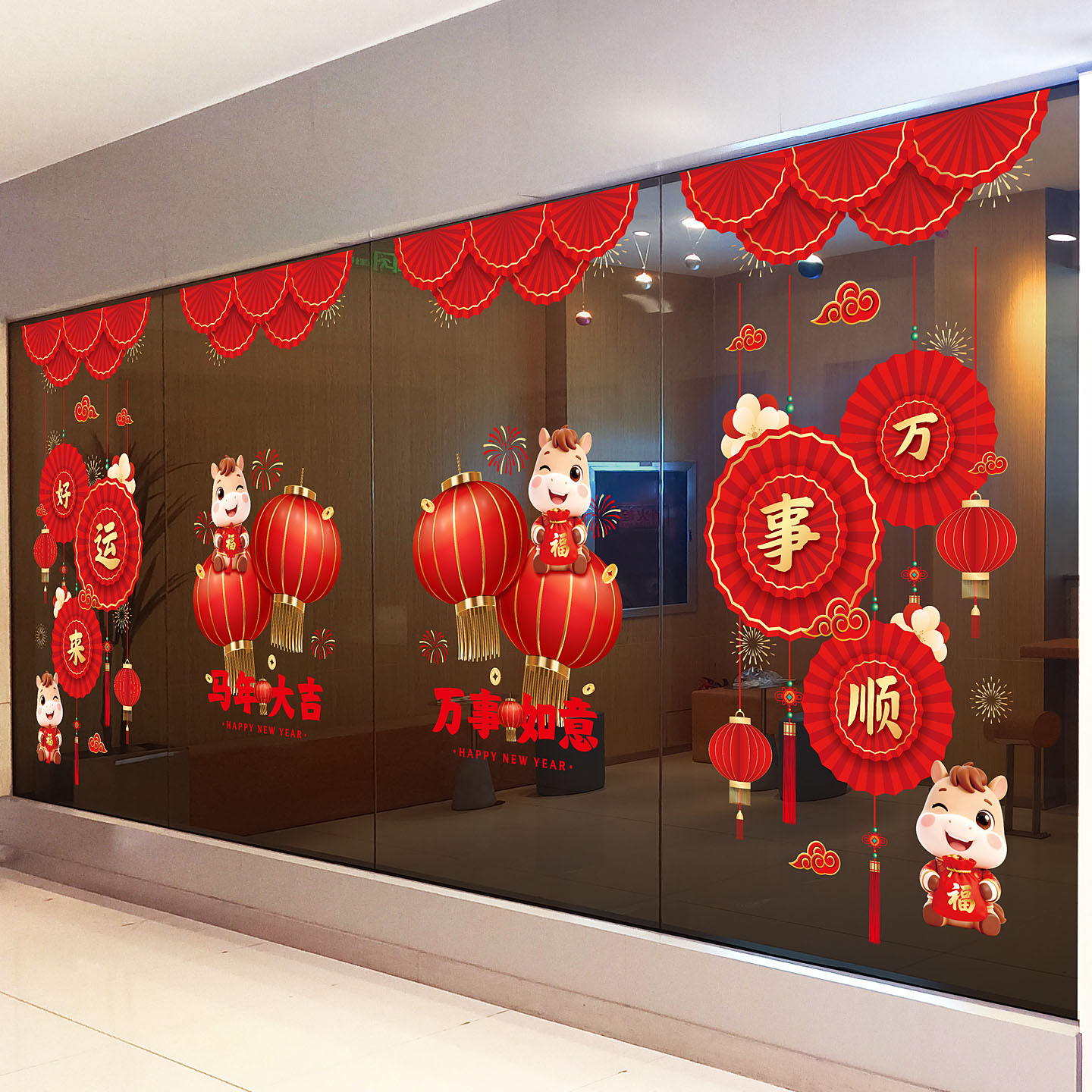 马年中式灯笼玻璃贴纸商场大型橱窗美化装饰2026春节窗花静电贴画